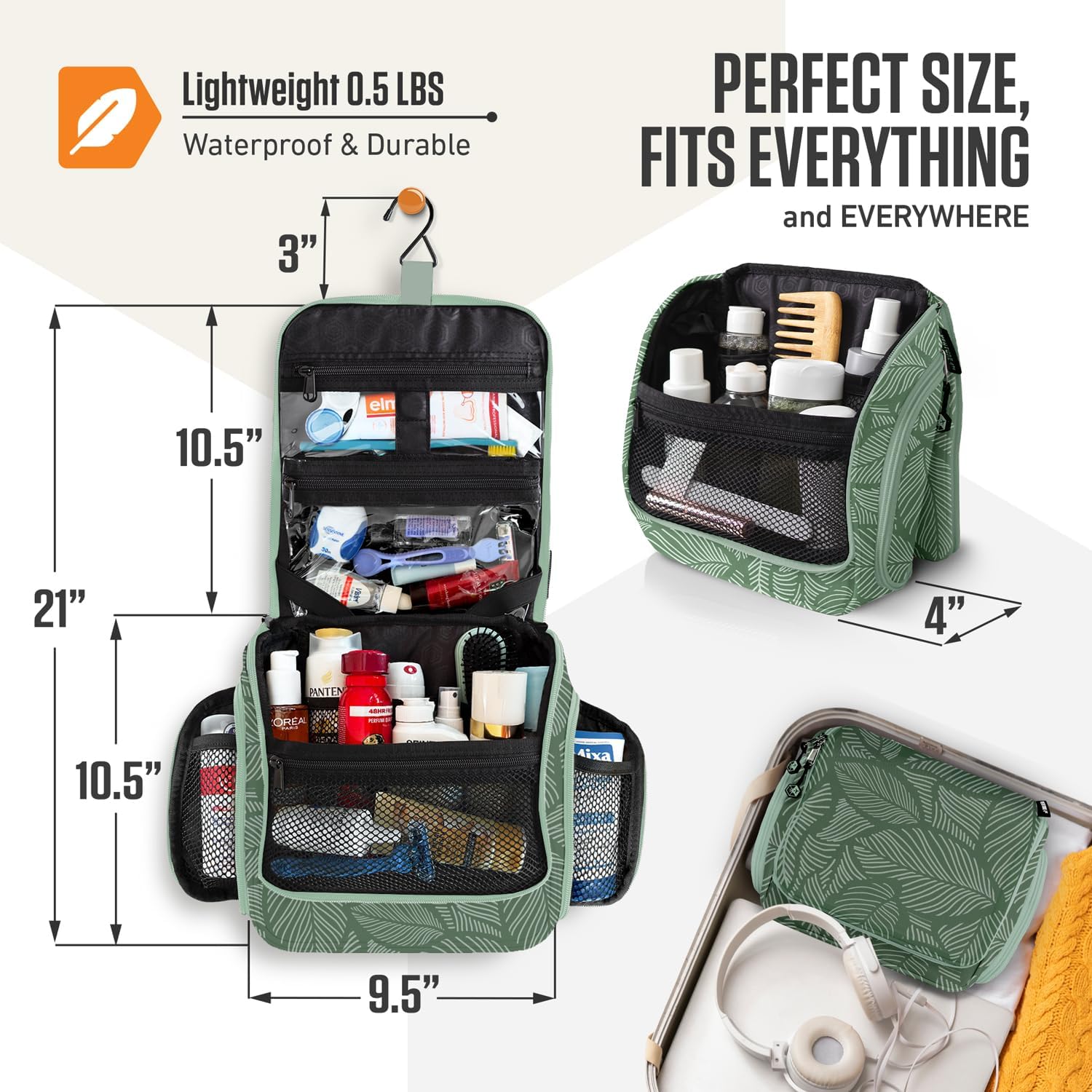 VENTURE 4TH Hanging Travel Toiletry Bag for Women & Men - Travel Organizer with Expandable Compartments & Removable Clear Pouch for Toiletries (Green Leaves)