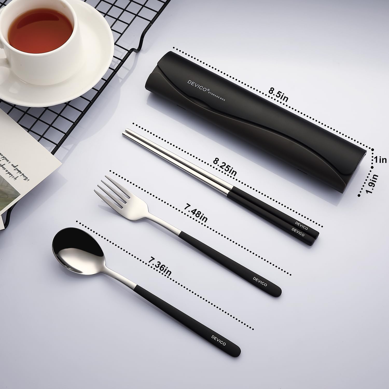 DEVICO Portable Travel Utensils with Case, Reusable Camping Silverware for Lunch, 18/8 Stainless Steel Cutlery Set (Black)