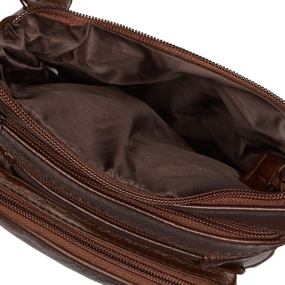 - Crossbody Purse With Unique Design - Our womens crossbody purse features 5 exterior zip pockets, including a top zippered main pocket, three front zippered pockets, one rear pocket, and a shoulder leather strap. These regular size crossbody purses for women have dimensions: 11.25" (height) x 9.75" (width).