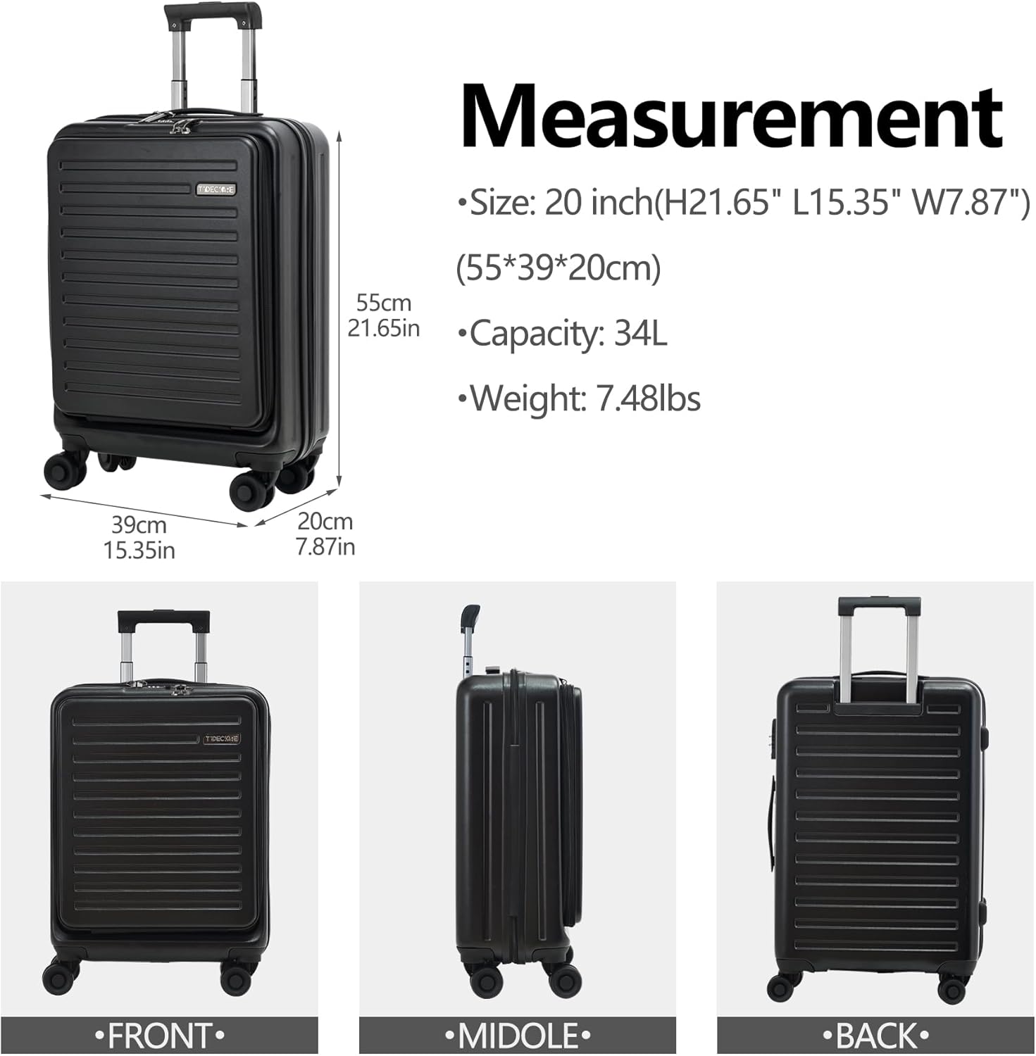 TydeCkare 20 Inch Carry On Luggage with Front Pocket, 21.65 * 15.35 * 7.87" Suitable for Airplane Overhead Bin, 34L Lightweight PC+ABS Hardshell with YKK Zipper, TSA Lock Approved, black