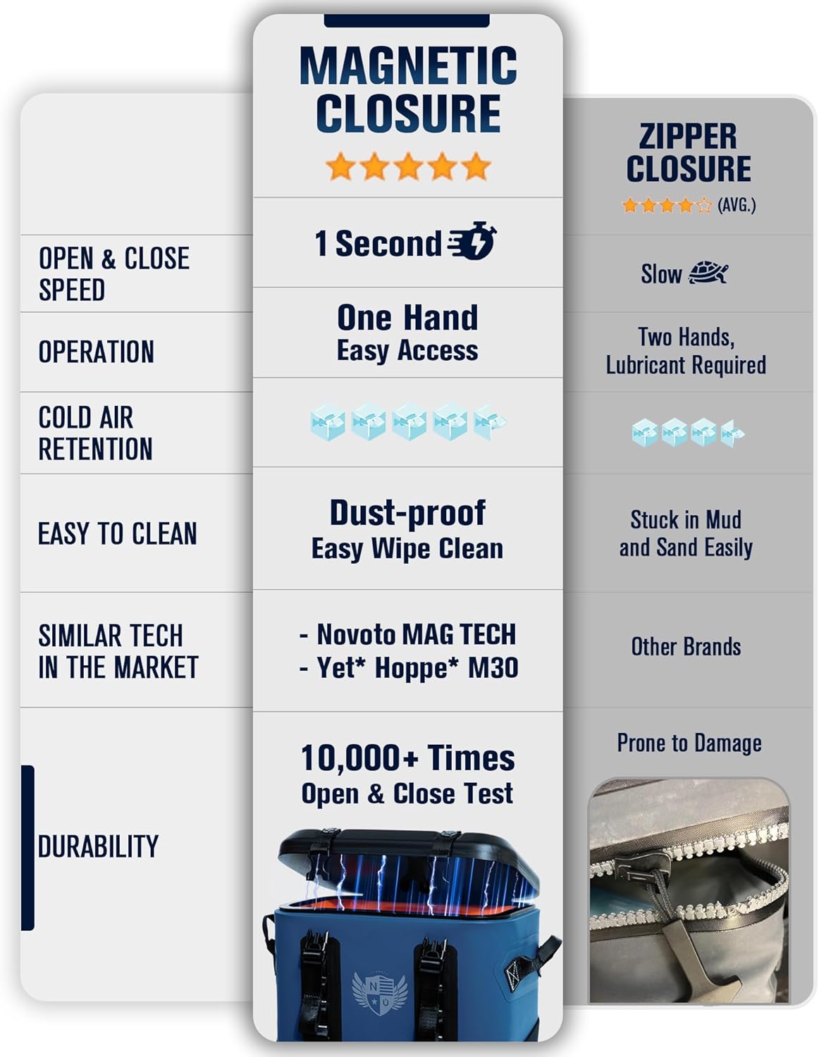- HANDS-FREE ZIPPERLESS COOLER - With a backpack design and magnetic lid, enjoy effortless carrying and one-handed operation. Forget about laborious and fragile zippers while driving, working, fishing, or during any high-focus activities.