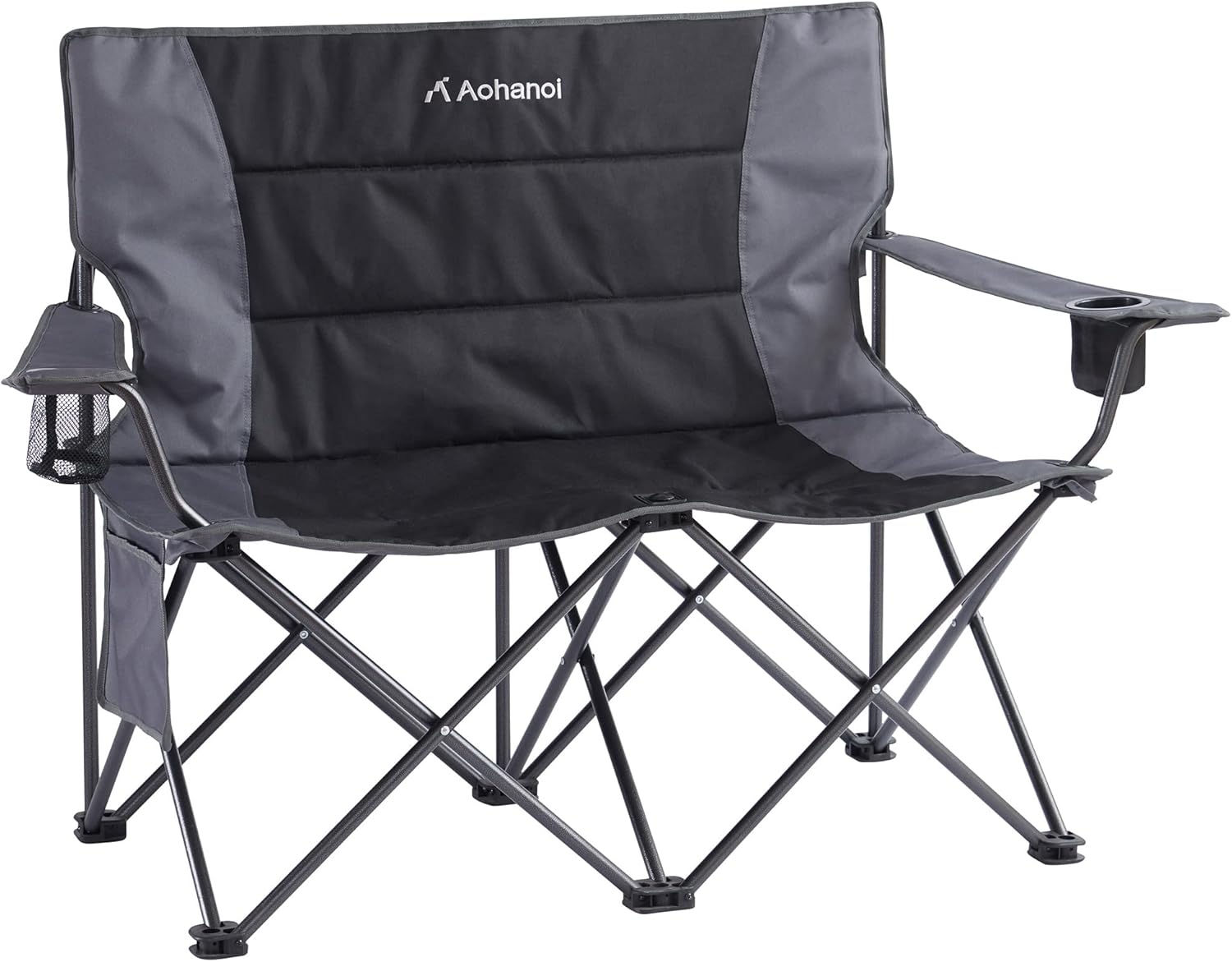 Oversized Double Camping Chairs for Adults, 2 Person Padded Folding Camp Chairs with 2 Cup Holders, Side Pocket for Outside, Picnic, Lawn, Big Heavy Duty Outdoor Loveseat, Black