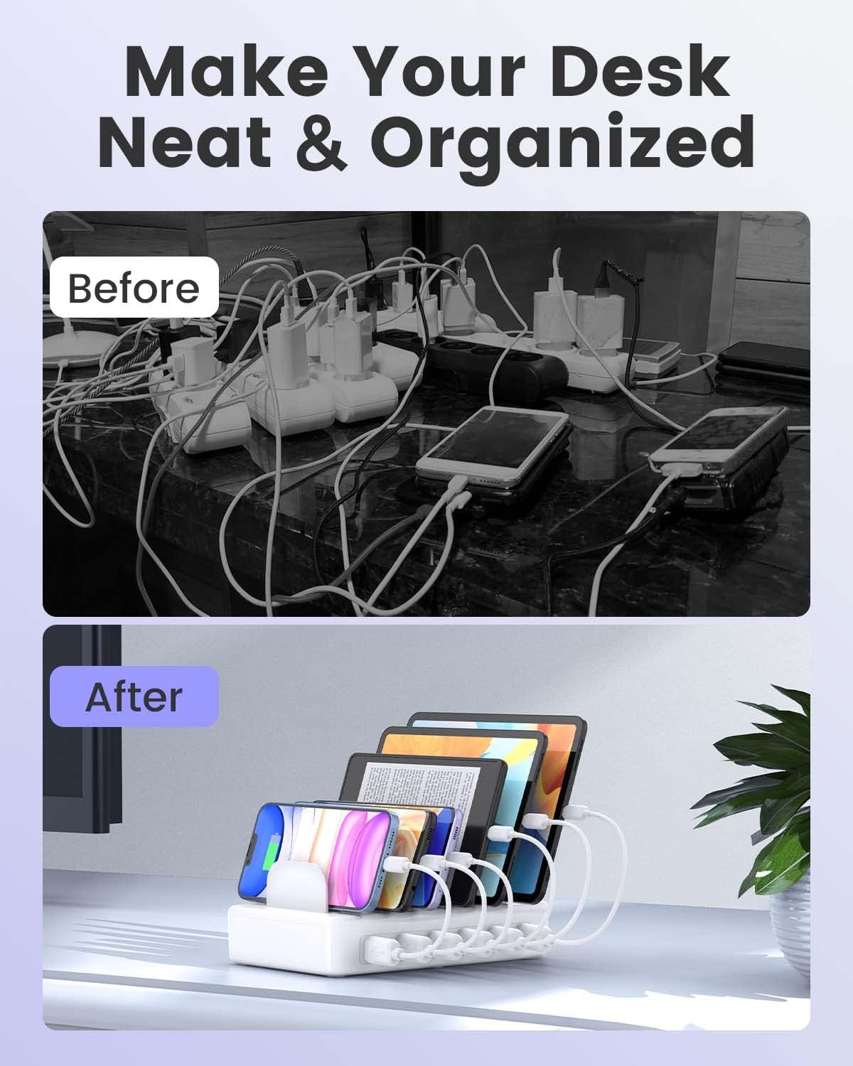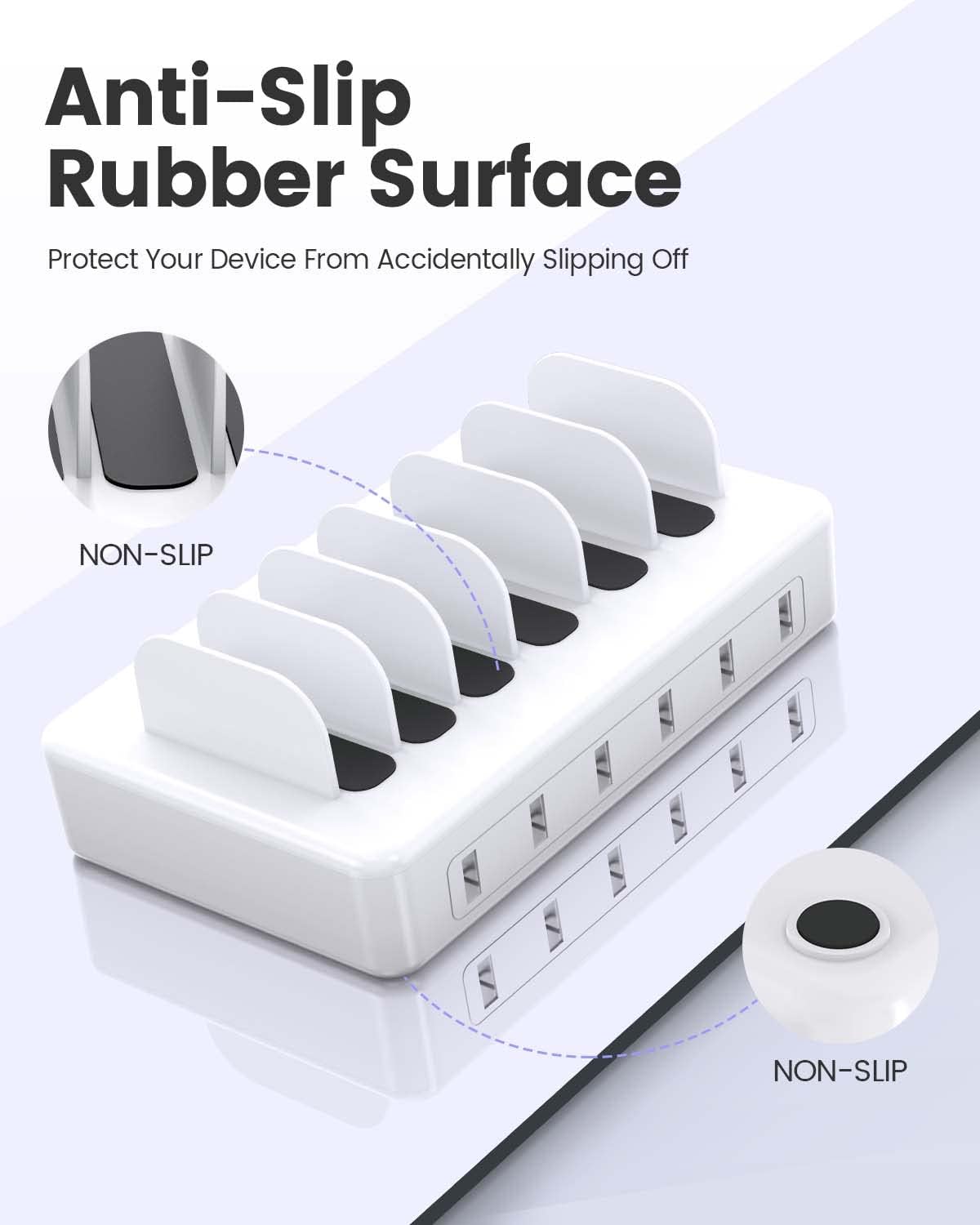 - 【6 IN 1 Charger Station】The charging station for multiple devices comes with 6 USB ports that hold various devices all in one place, keeping your phones, watches, earbuds, power banks, tablets, and other devices charged quickly and efficiently at one time. Our multi charger station is faster than regular chargers. It can charge your devices up to 80% faster because it provides more power - up to 2.4A compared to the 1A provided by regular chargers