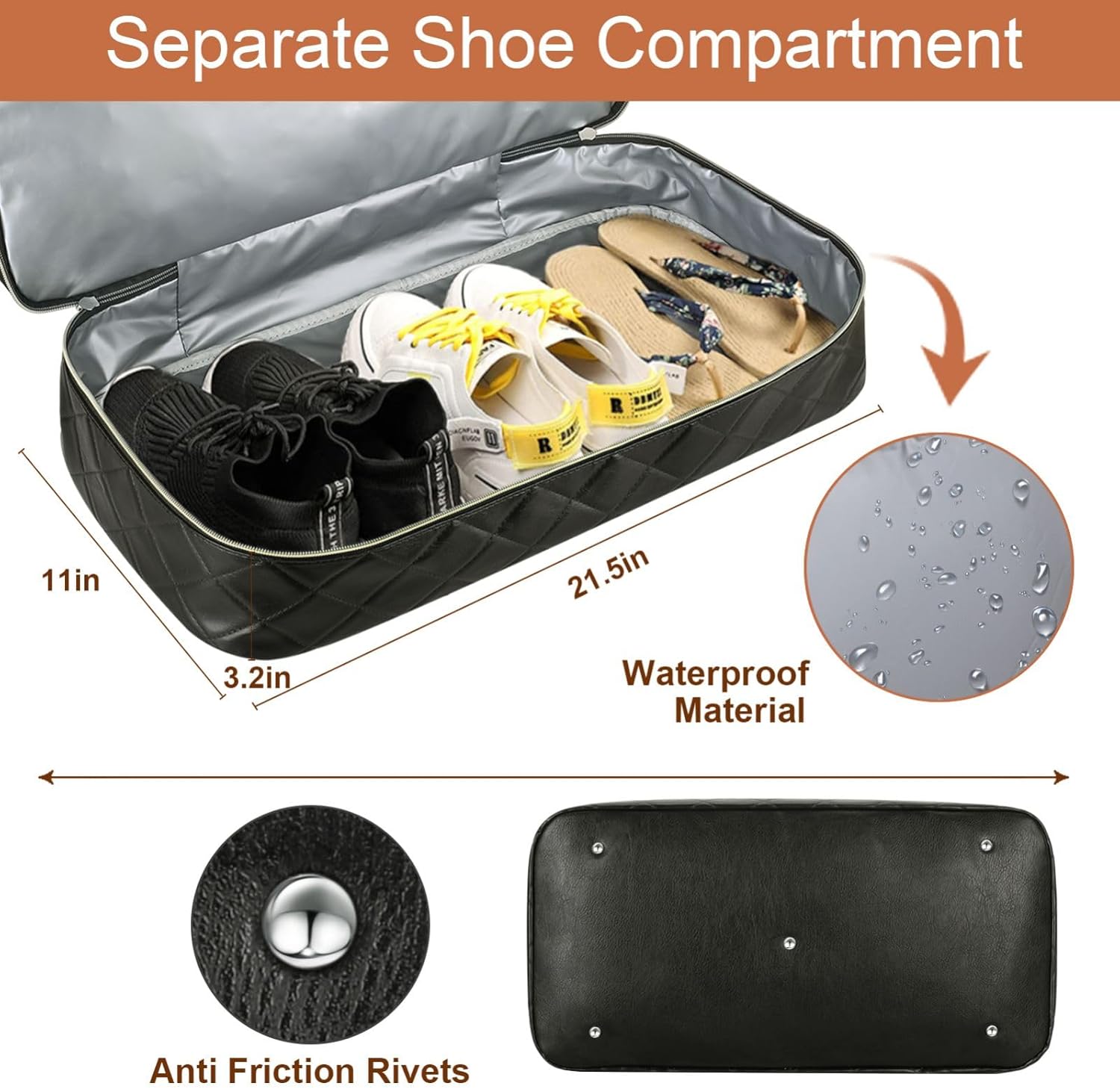 - Waterproof Separate Shoe Compartment: The shoes compartment of this travel duffle bag is fashioned with PVC waterproof materials to facilitate carrying your shoes during travel. This compartment can also be used to hold dirty clothes or wet towels, separating wet and dry to prevent your clean luggage from getting soiled or wet. Shoes compartment size: 21"Lx11"W*3.2"H and can fit up to 3 pairs of shoes. The thicker bottom can better carry weight.