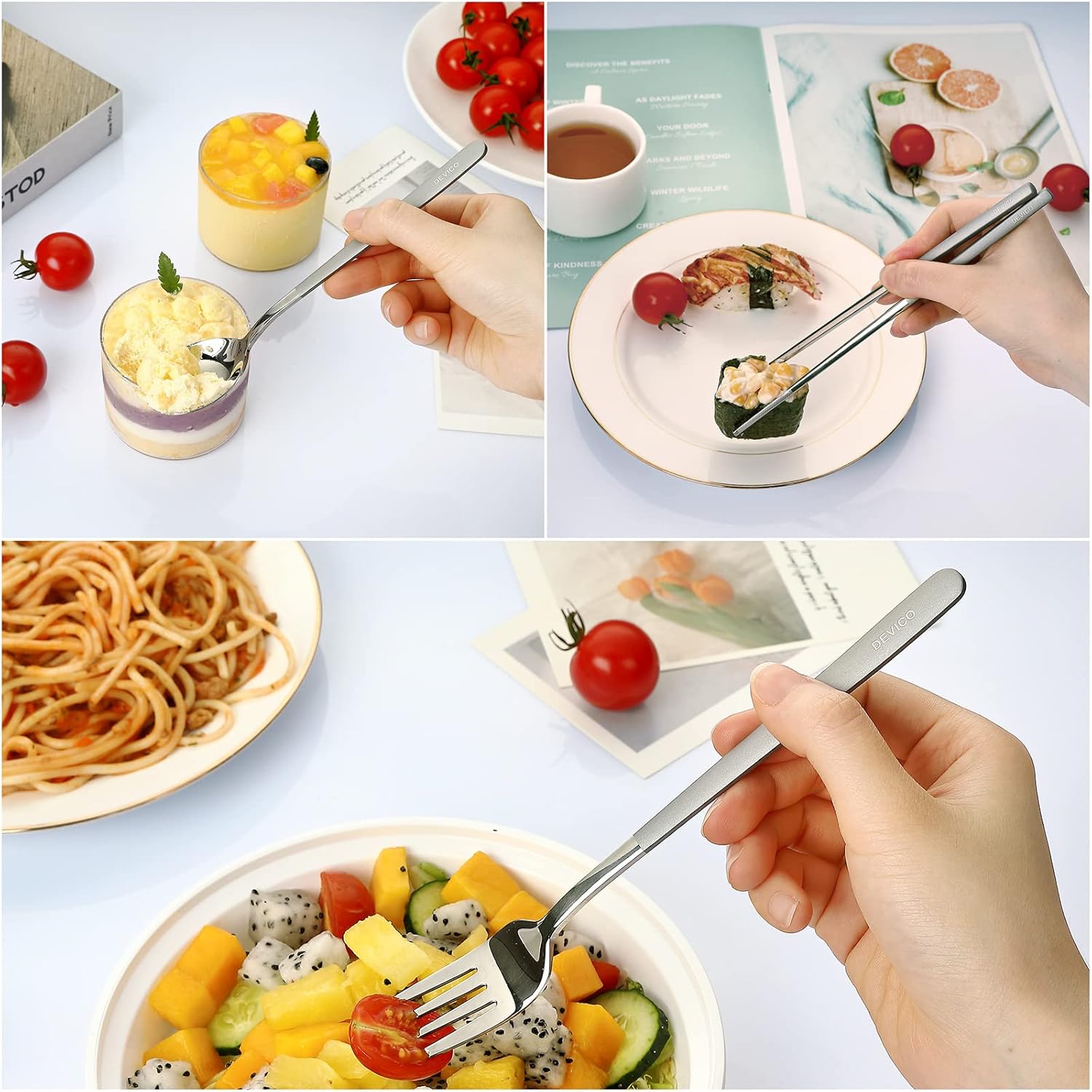 - MODERN DESIGN: The travel spoon with no sharp edges and no rough spots, bright face, fine workmanship. The travel fork polished through multiple processes, long teeth can easy to insert, but won't cut the lips. The travel chopsticks with laser anti-slip texture, easy to use