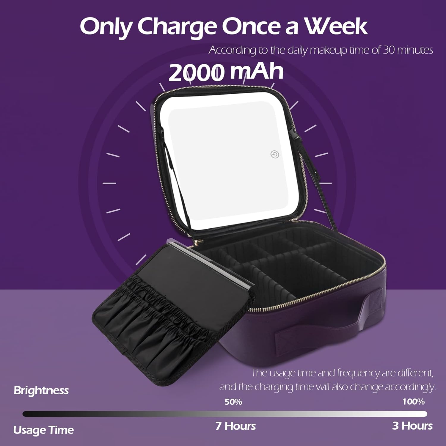 MOMIRA Travel Makeup Bag Cosmetic Bag Makeup Organizer Bag with Lighted Mirror, Adjustable Brightness in 3 Color Scenarios, Waterproof Makeup Train Case, Gift for Women - Deep Purple