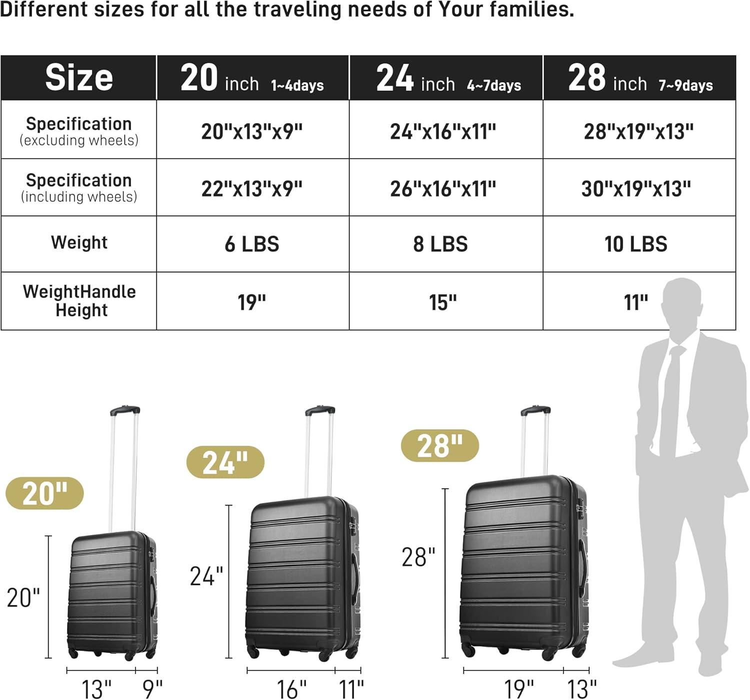 Merax Luggage Sets of 3 Piece Carry on Suitcase Airline Approved,Hard Case Expandable Spinner Wheels (Black)