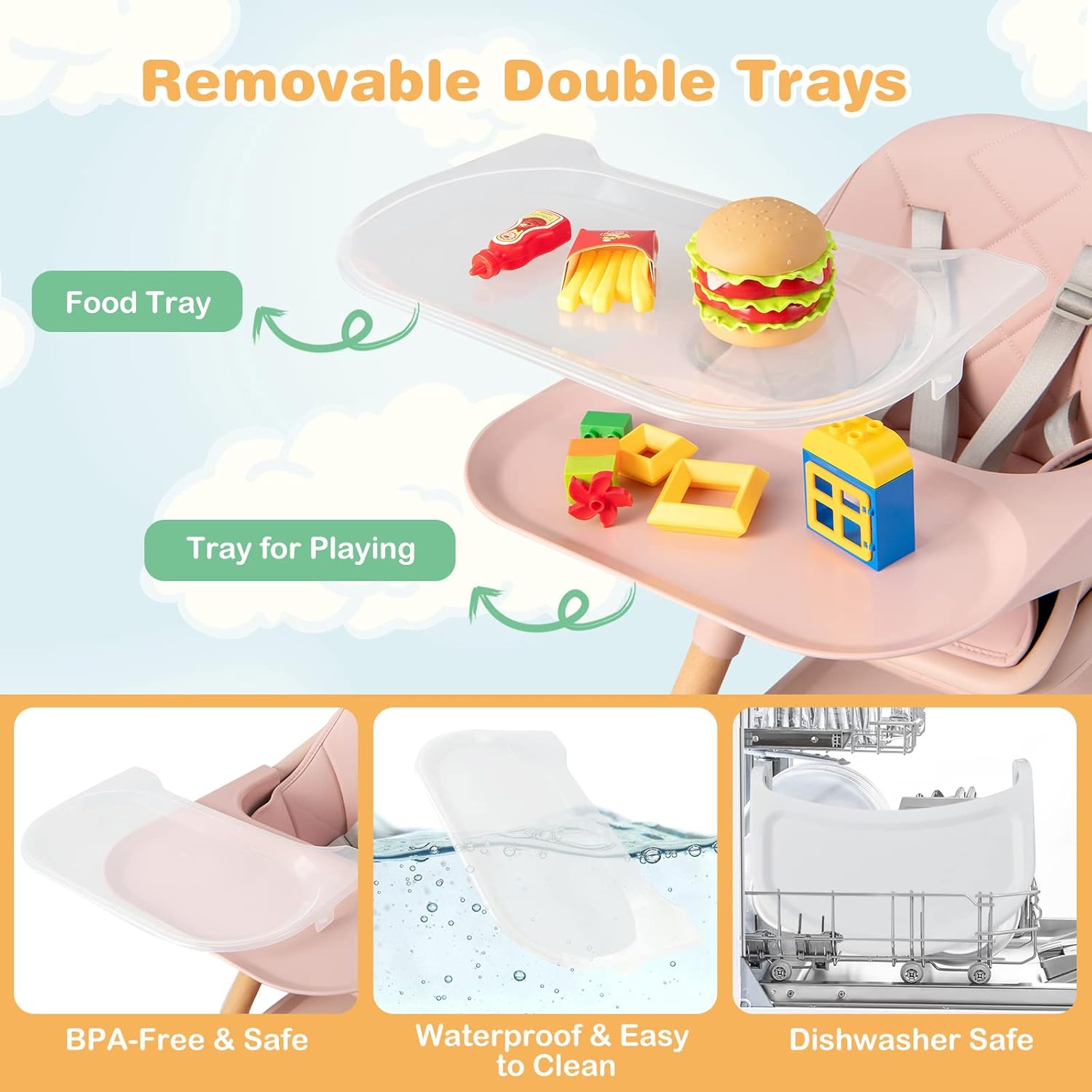 - 【Removable Double Trays】This convertible baby high chair comes with an upper food tray and a lower tray for playing. The trays are made of BPA-free & safe PP material. In addition, they are removable, dishwasher safe, waterproof and easy to clean.
