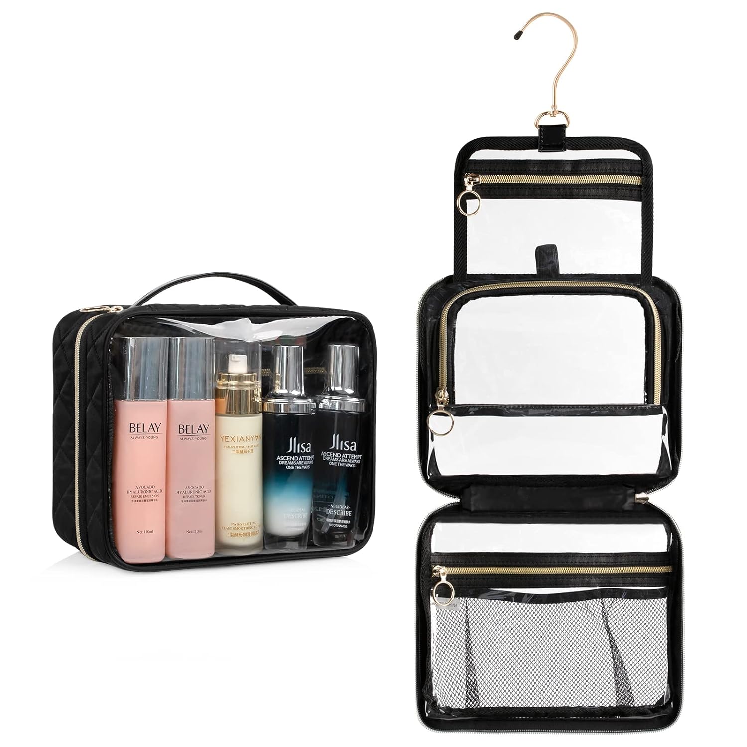 - Premium Material —— Premium Transparent PVC & Polyester Fibre | ▪ Color: Black | ▪ Size:(L*W*H)9.44×3.93×7.28 inches | ▪ Package Include: 1× Clear Hanging Toiletry Bag;【NOTE: The Toiletries Accessory & Cosmetic Are Not Include】
