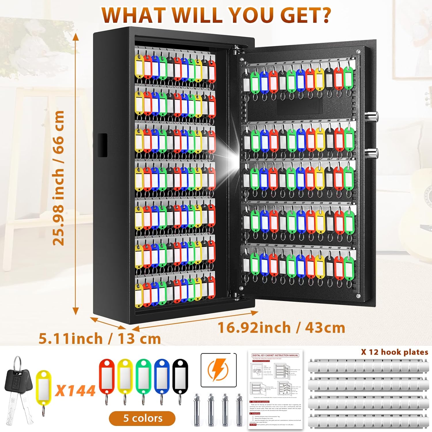 - Key Lock Box With Hook Plates And Key Tags: The key lockbox has adjustable hook plates, which can be installed at different heights according to the size of the keys that you are hanging. There are slots for storing keys on the hook plate of the key organizer, which is convenient for you to hang or take off the keys. The locking box can store 144 keys. The keybox wall mount comes with color-coded key tags. You can label and hang all your keys and you can easily find the ones you are looking for.s you are looking for