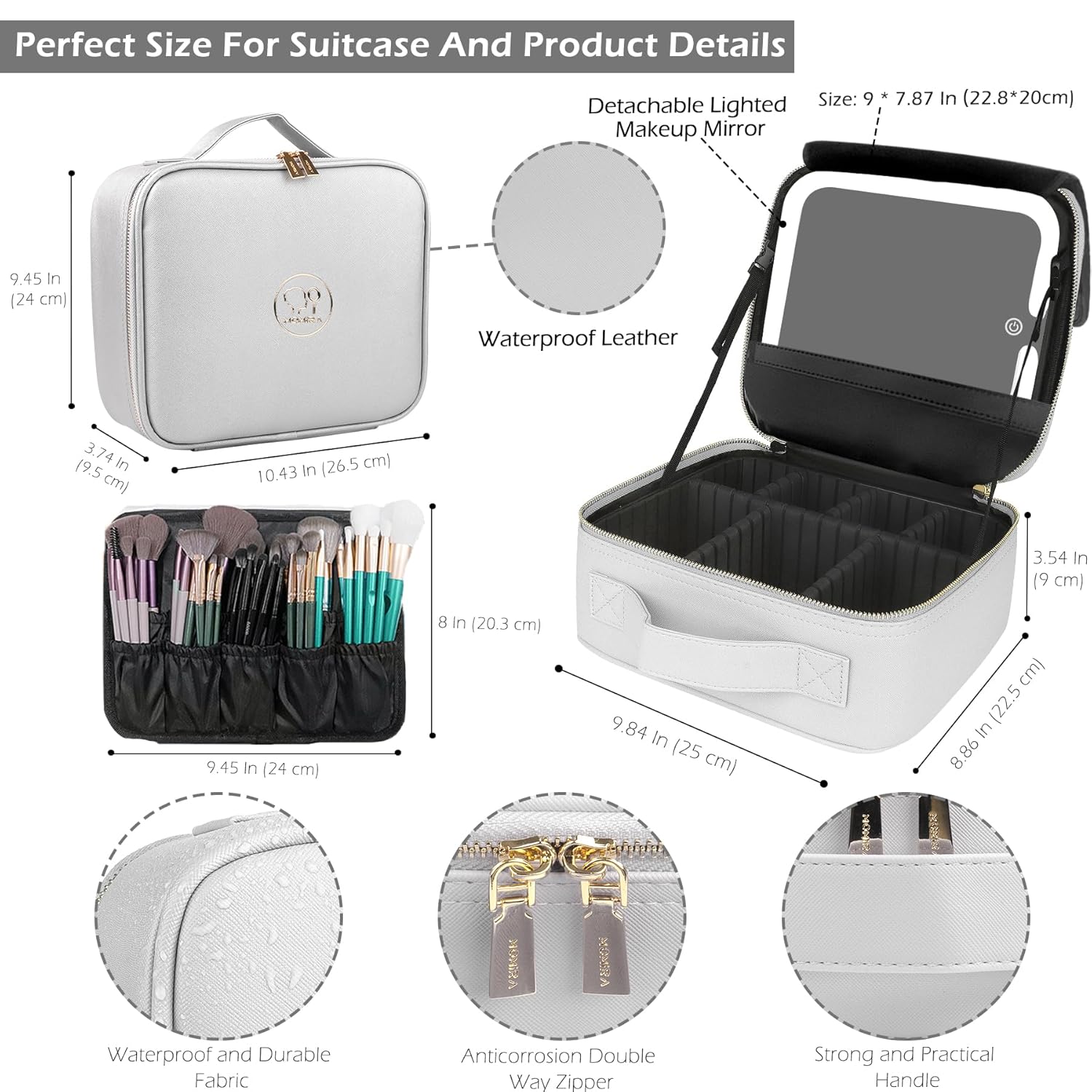 MOMIRA Travel Makeup Bag Cosmetic Bag Makeup Organizer Bag with Lighted Mirror, Adjustable Brightness in 3 Color Scenarios, Waterproof Makeup Train Case, Gift for Women - Silver