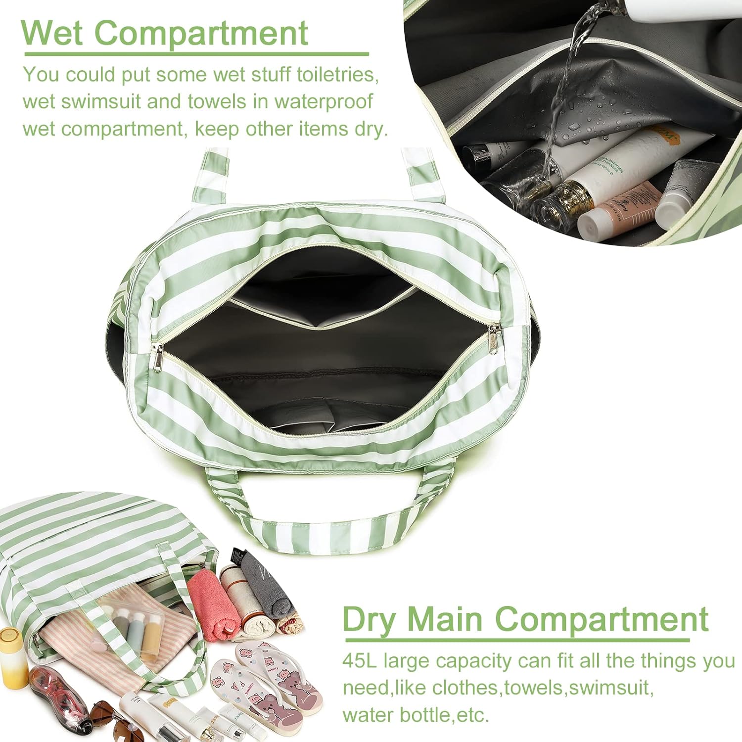 - Wet Pocket: Unlike other beach tote bag, this one is up-graded with separate waterproof wet compartment which you can put into some wet stuff Toiletries, wet swimsuit and towels, keep other items dry all the day.