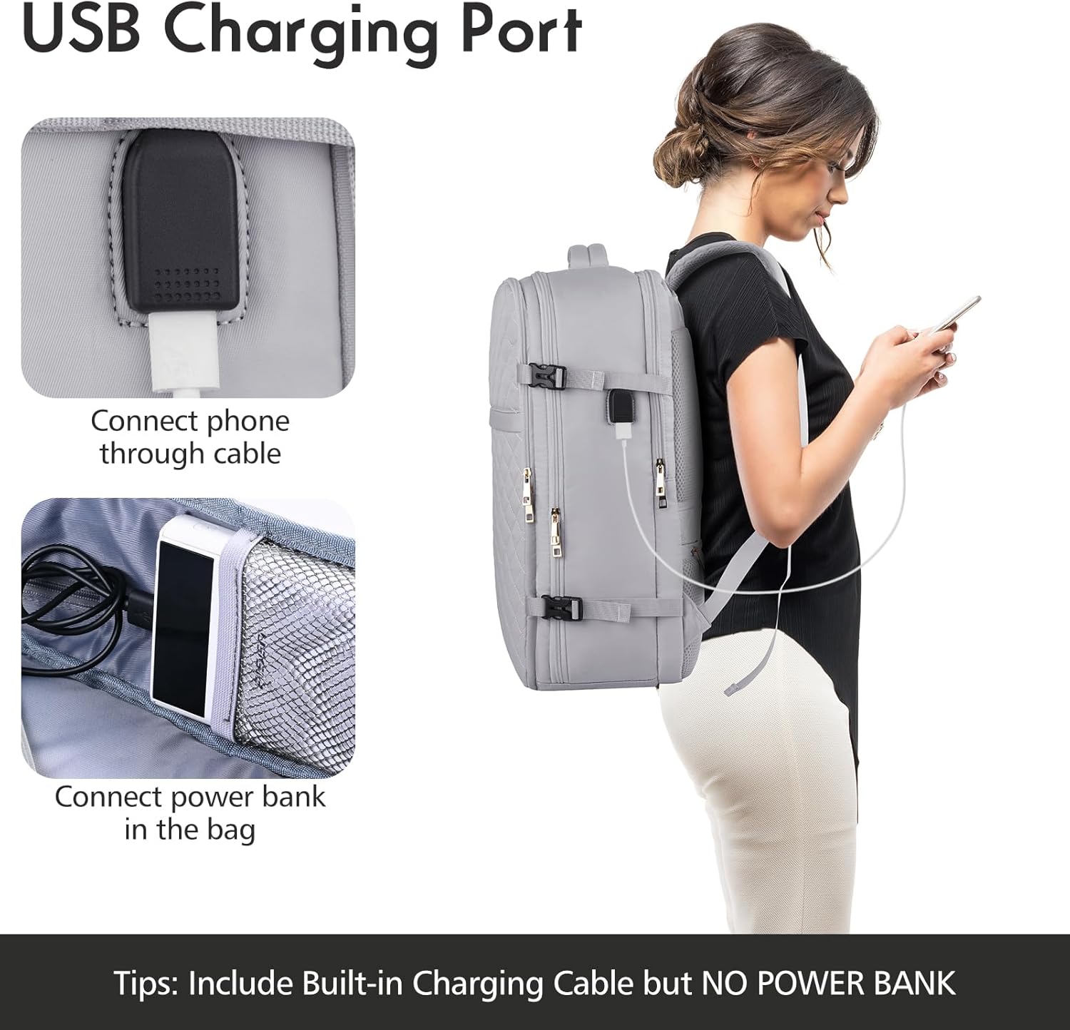 - 【USB Port Design,Anti-theft Pocket&Luggage Strap】:USB interface with built-in cable design, great convenience for charging your electronic devices via connecting your own power bank. Comfortable breathable back design gives you maximum back support; A luggage strap allows the travel backpack to securely slip over the handle of any rolling luggage for hands-free transport, easier carrying. A hidden anti theft pocket on the back protect your valuable items from thieves.