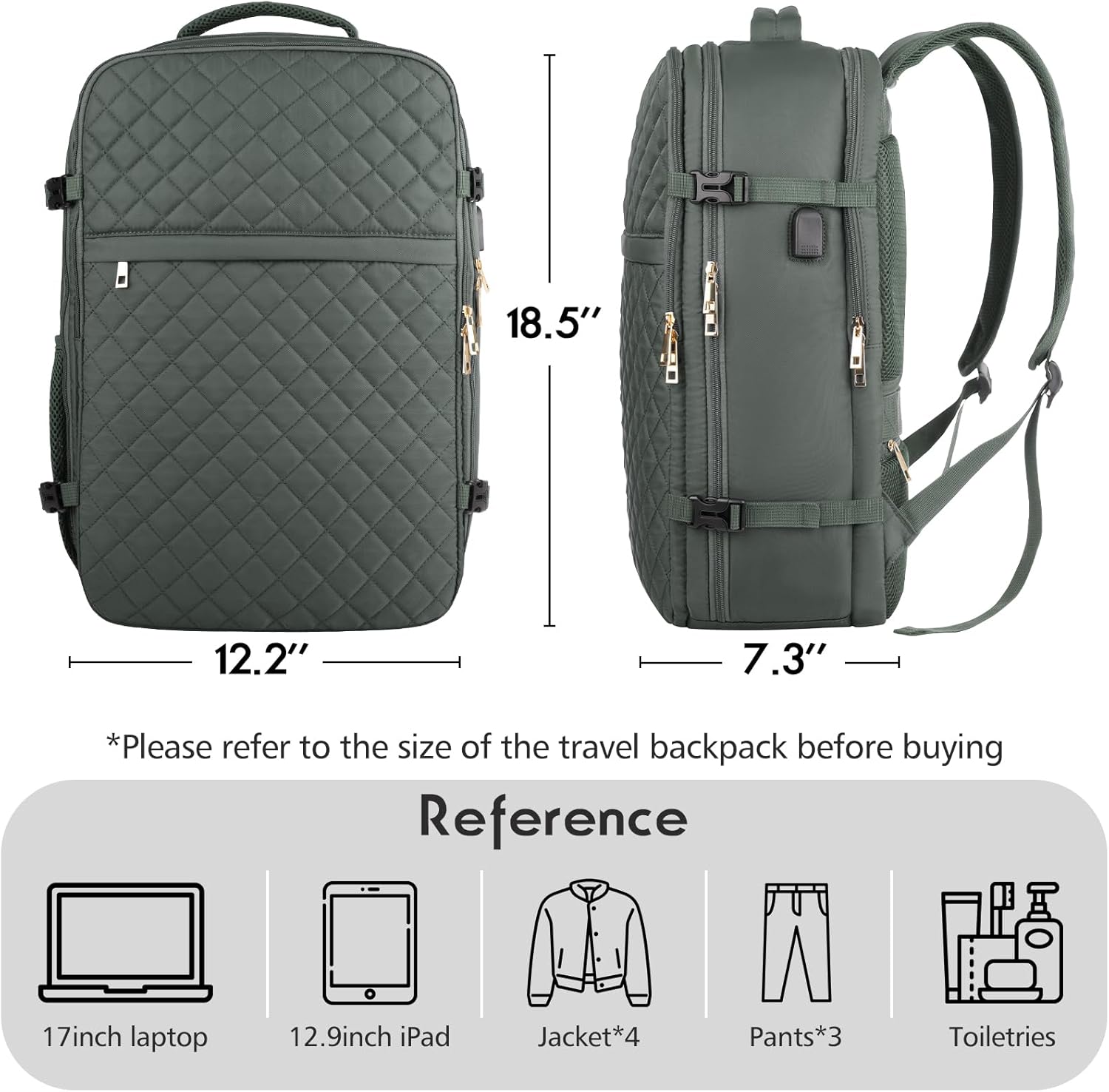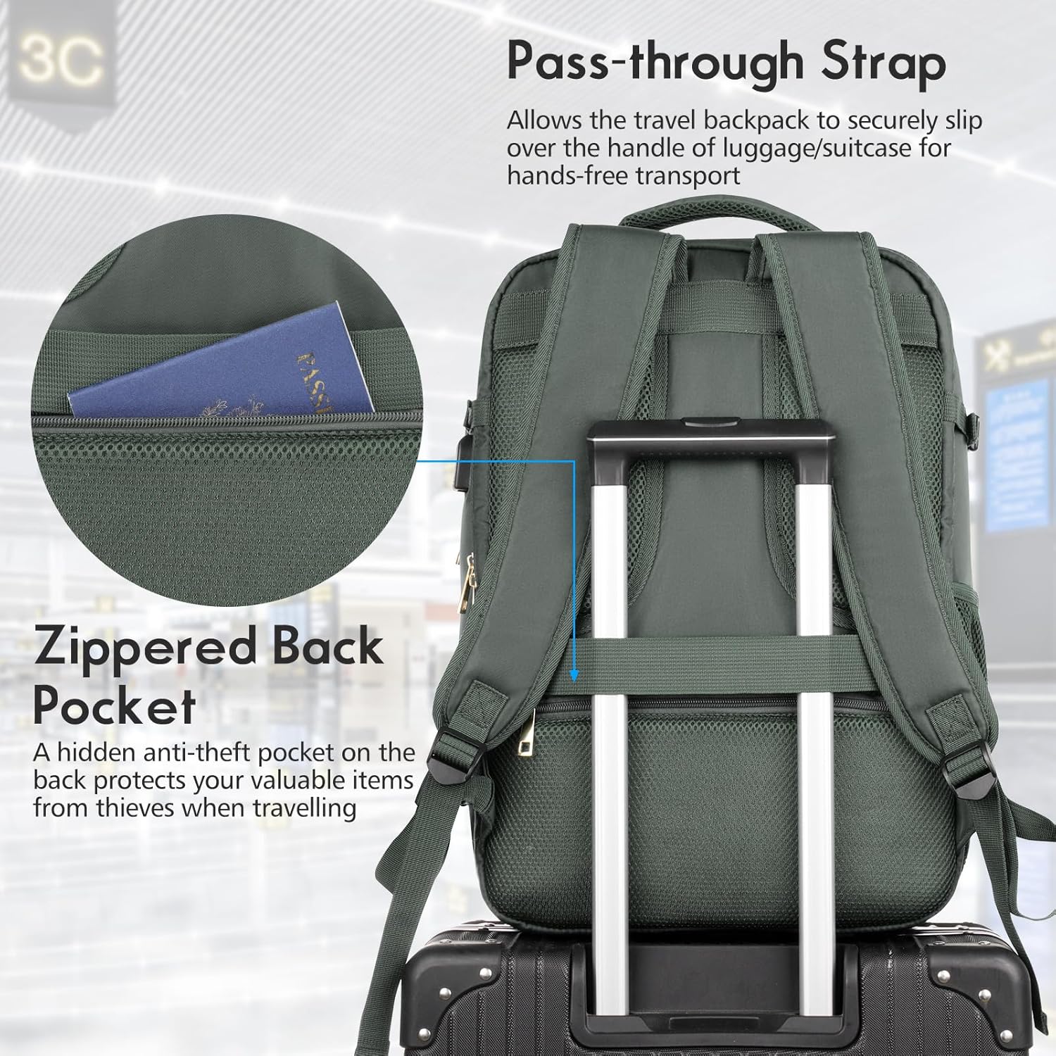 MOMUVO Large Travel Backpack Women, Flight Approved Carry On Backpack, Water Resistant Anti-Theft Large Casual Daypack Fit 17 Inch Laptop with USB Charging Port, Olive Green