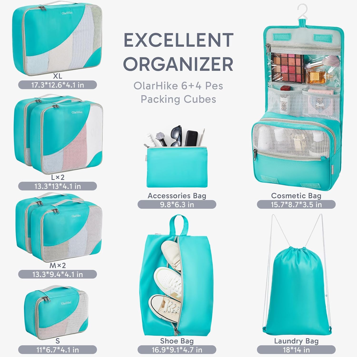 ALL INCLUDED 10 Set Durable Packing Cubes for Suitcases,OlarHike Essentials for Travel, UPGRADED Anti-Tear Stitching, NEW Improved Luggage Packing Organizers for Travel Accessories (Turquoise)