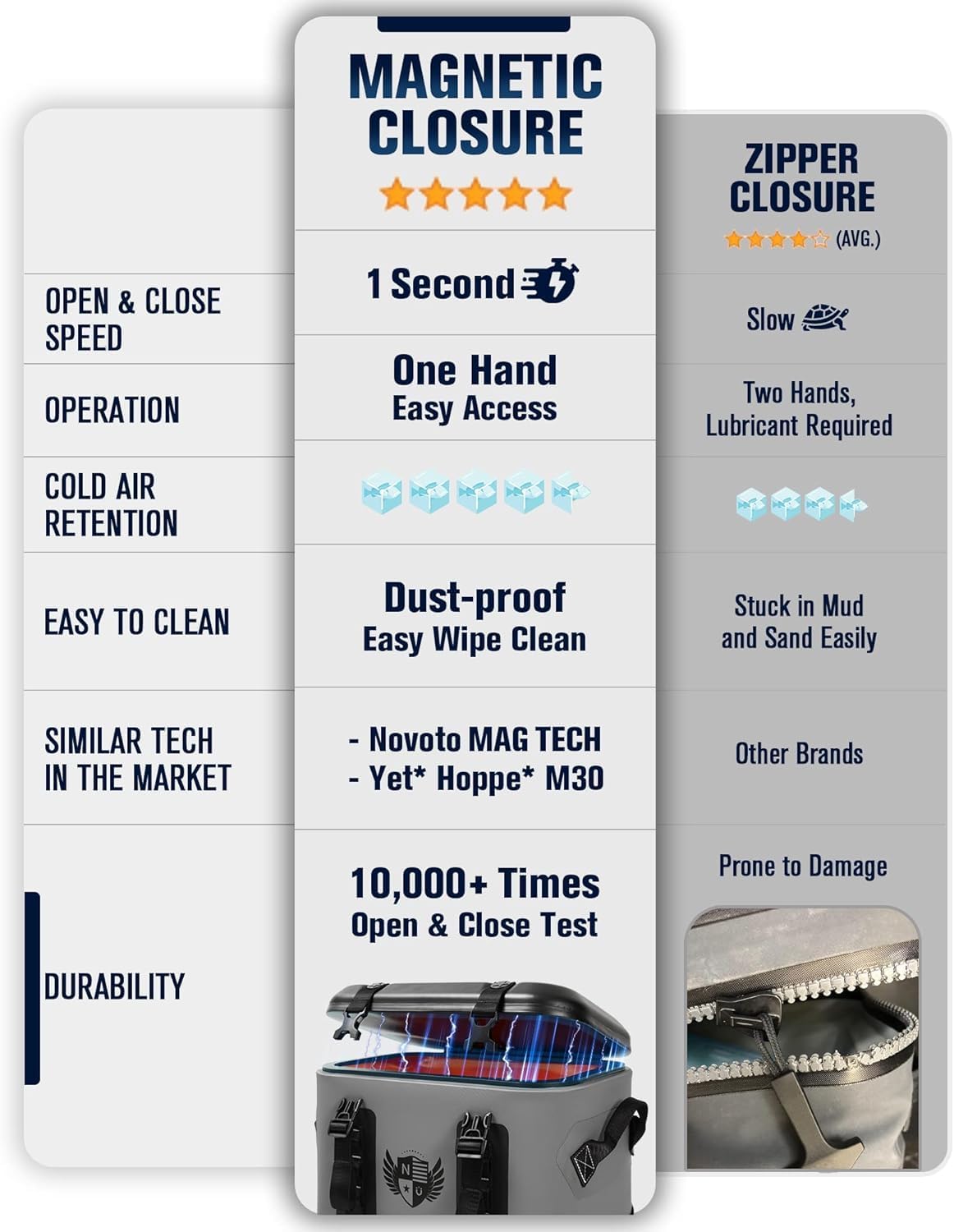 - HANDS-FREE ZIPPERLESS COOLER - With a backpack design and magnetic lid, enjoy effortless carrying and one-handed operation. Forget about laborious and fragile zippers while driving, working, fishing, or during any high-focus activities.