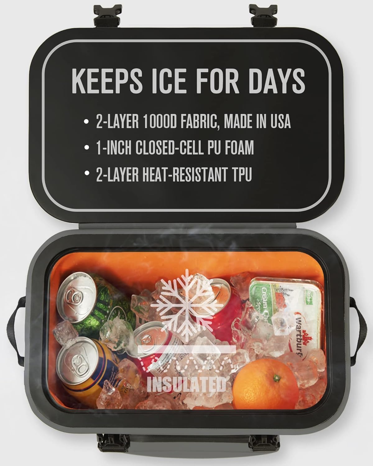- GUARANTEED PERFORMANCE - Crafted from water-resistant material, the cooler is durable, easy-to-clean, and sand-resistant. Its magnetic lid and dual buckles ensure unrivaled leakproofness in various outdoor environments.