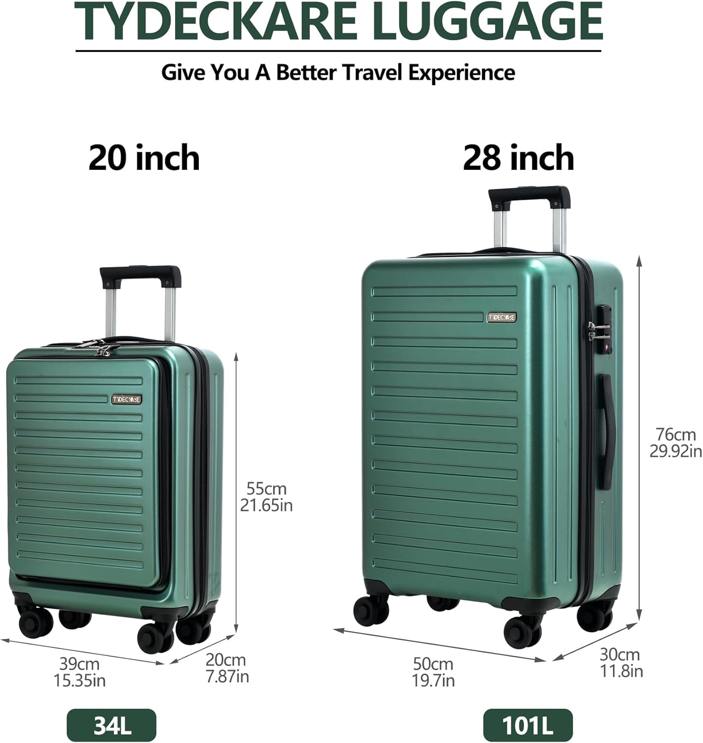TydeCkare 2pcs 20/28" Luggage Set Lightweight HardShell, Only 20 Inch Carry On 21.65 * 15.35 * 7.87" Cabin Suitcase with Front Pocket, 28 Inch 19.68 * 11.81 * 29.92" Checked Luggage, Green