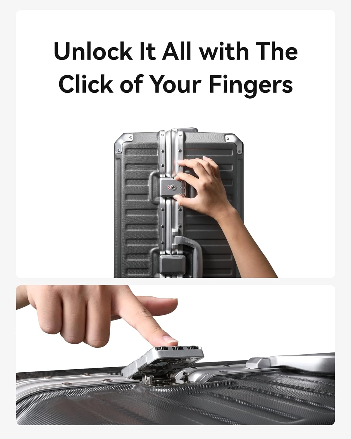 - Aluminum Frame + 100% PC:One-piece molded aluminum frame for deformation resistance and reinforcement; 100% PC case, with superior toughness and resilience compared to ABS+PC, providing 360° robust protection for luggage safety.