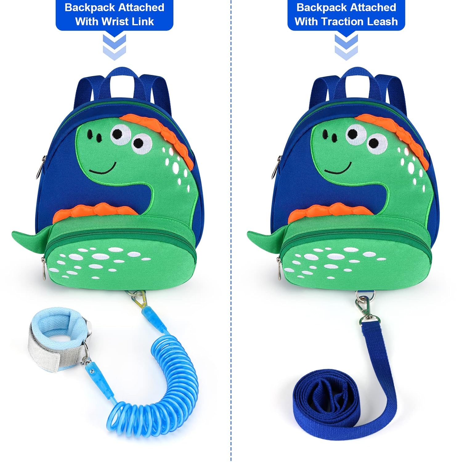 - 4 Ways to Use: ⑴ Child can wear it as a backpack. ⑵Dinosaur backpack + leash. ⑶ Dinosaur backpack + wrist link. ⑷ anti-lost wrist link. With this backpack with wrist leash, you don’t have to worry that your curious kid will wander lost.
