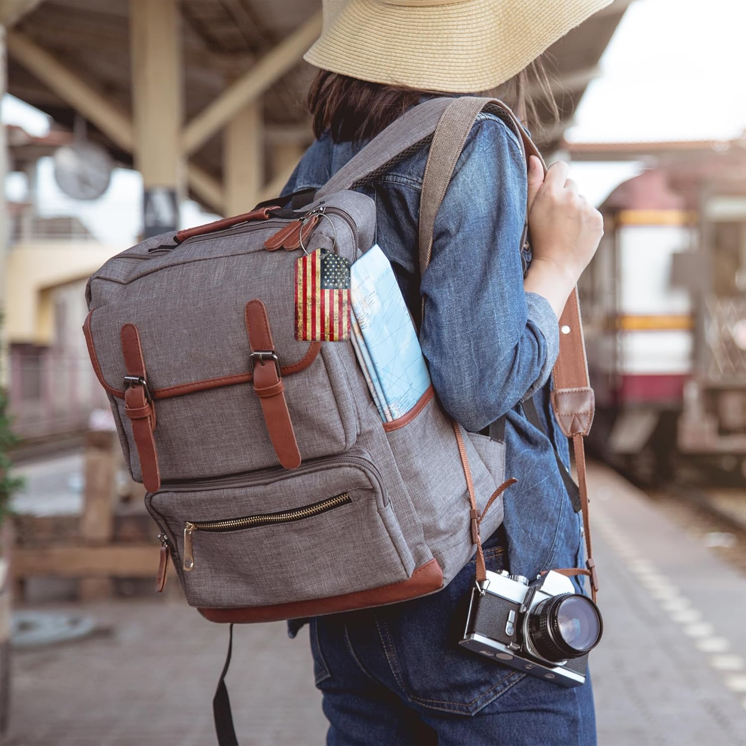2 Pack Luggage Tag for Suitcase,Retro USA Flag PU Leather Suitcase Tags Identifiers with Privacy Name Address Labels and Durable Steel Loop for Women Men Travel