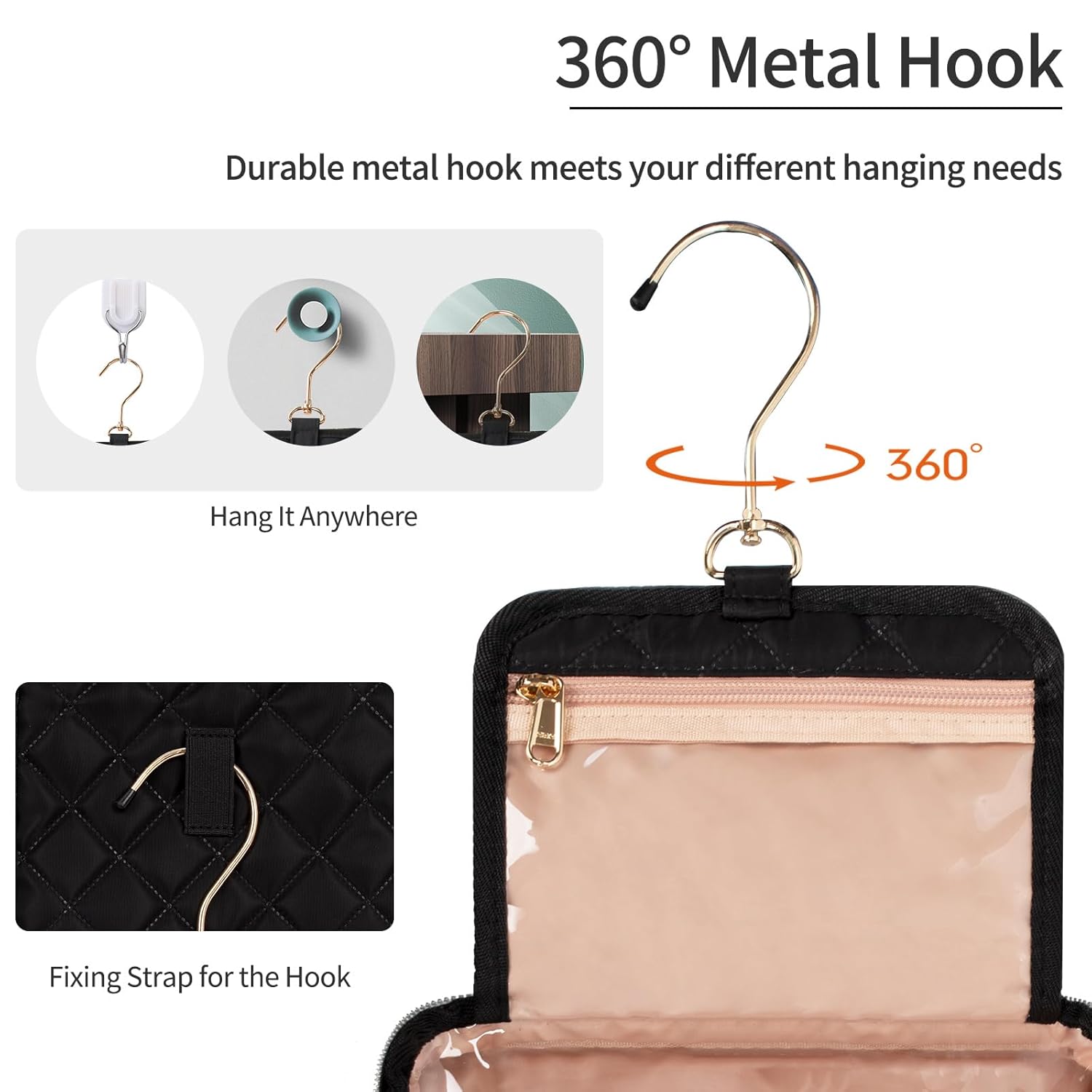 - CONVENIENT HANGING - The sturdy and durable metal hook is perfect to hang the toiletry bag anywhere so it doesn't take up a lot of counter space. Large diameter 360° swivel metal hook for versatile hanging options. It can even be hung on doors.