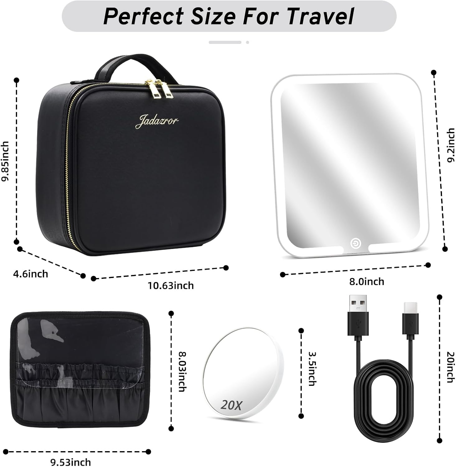 - 【Premium Makeup Bag with Mirror】This lighted makeup bag is made of high-quality waterproof and scratch-resistant PU leather fabric, durable and easy to clean. Sturdy handle design allows you easily take the makeup travel bag away. Jadazror makeup bag with mirror and lights is perfect choice for travel.