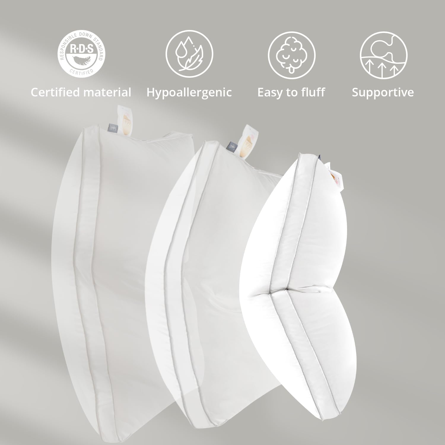 - UNRIVALED SUPPORT AND SOFTNESS: Embrace the perfect balance of support and softness with three-chamber filling design. This unique construction ensures that our feather pillow cradles your head with gentle support while maintaining a sumptuously soft touch. Bid farewell to any discomfort as our premium natural fabric envelopes you in pure opulence.