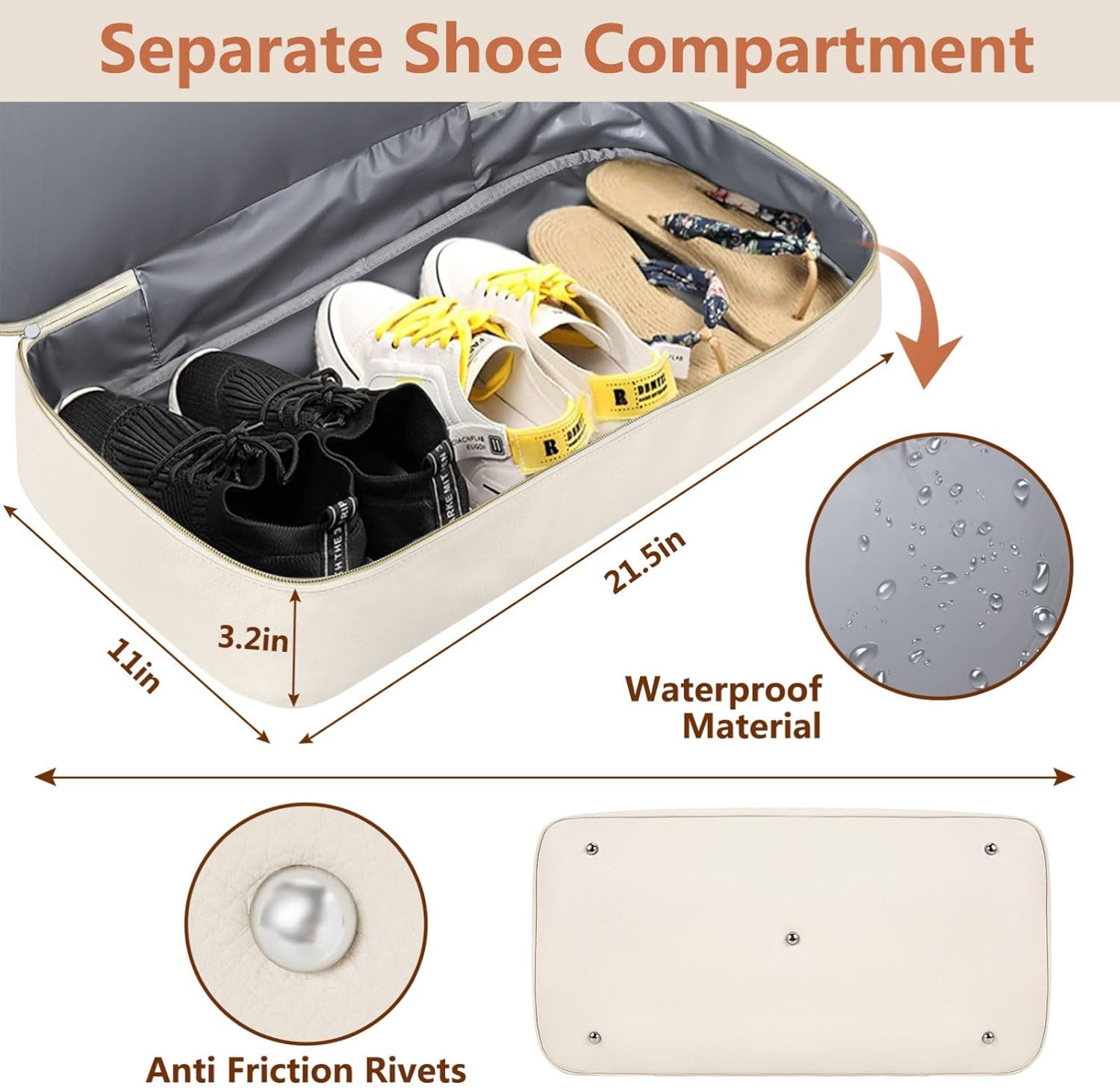 • Waterproof Separate Shoe Compartment: The shoes compartment of this travel duffle bag is fashioned with PVC waterproof materials to facilitate carrying your shoes during travel. This compartment can also be used to hold dirty clothes or wet towels, separating wet and dry to prevent your clean luggage from getting soiled or wet. Shoes compartment size: 21"Lx11"W*3.2"H and can fit up to 3 pairs of shoes. The thicker bottom can better carry weight.