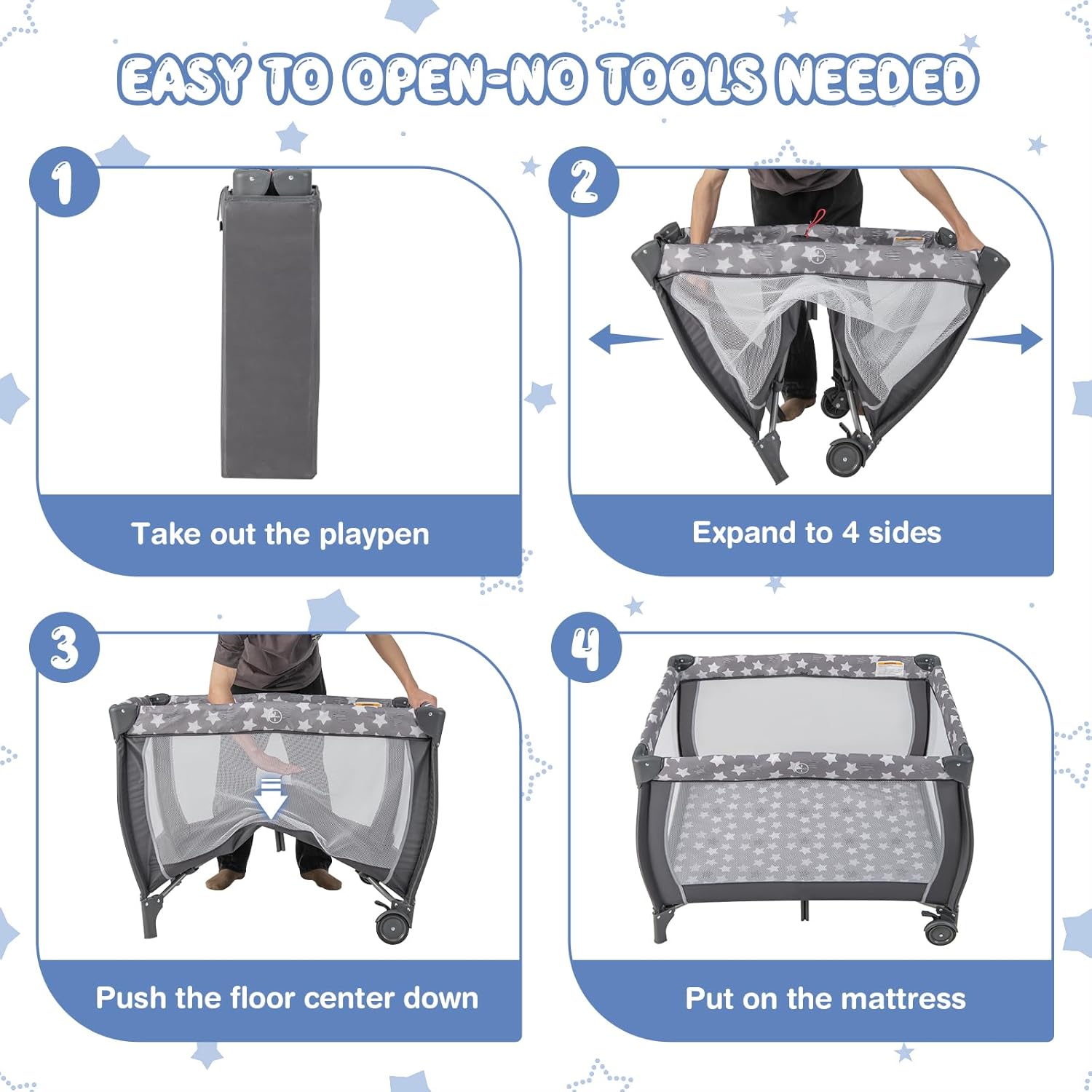 - 【Simple to Setup & Fold】 The 3-in-1 corrales para bebes is easy to open and there are no tools needed. The following are the expanding steps: ①Take out the playpen, ②Expand to 4 sides, ③Push the floor center down, ④Put on the mattress. And the carry bag renders each outing easier.