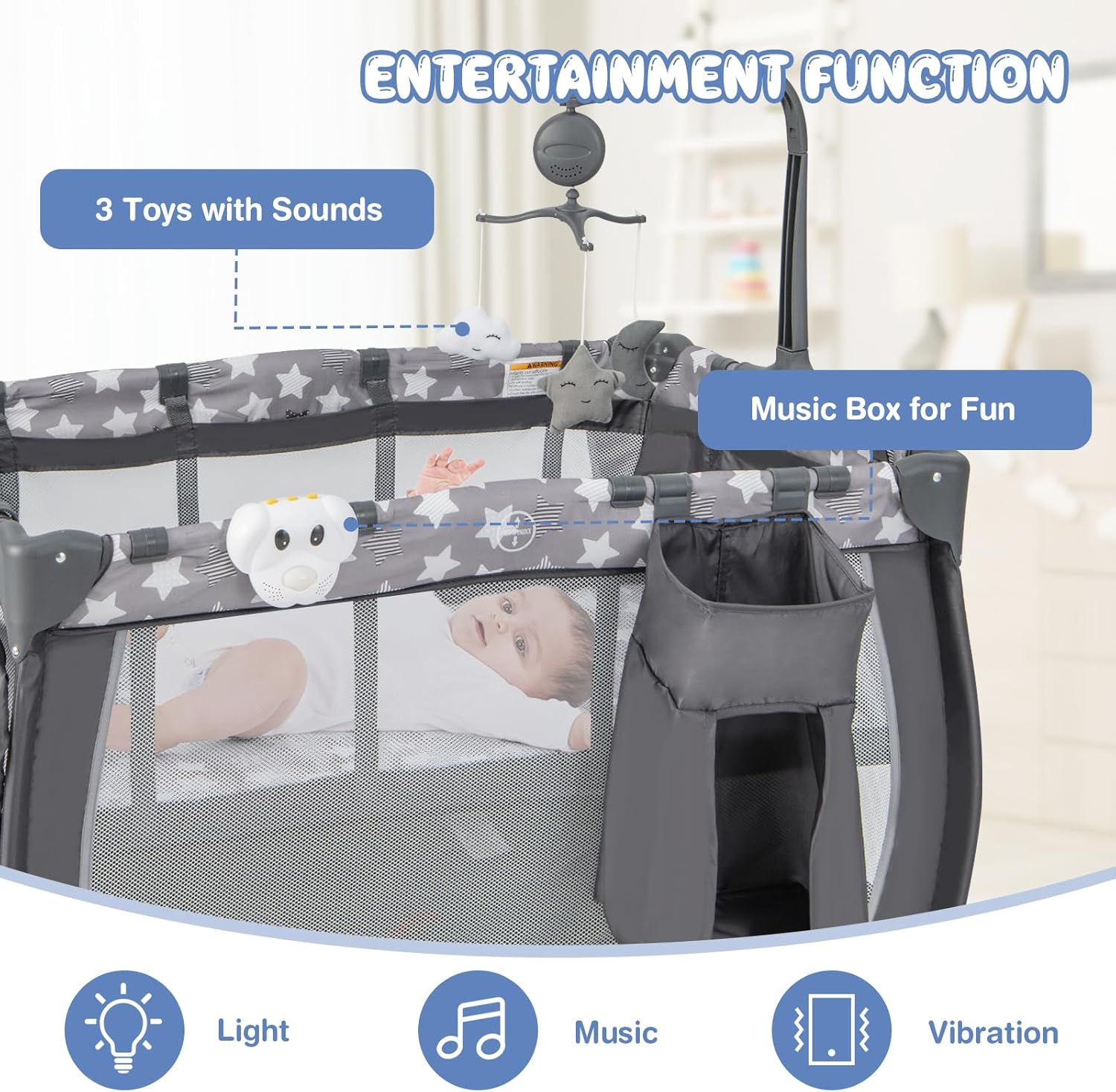 - 【Entertainment Function】This foldable baby crib comes with a rotating toy bar, where there are 3 toys with sounds to entertain babies. More importantly, the music box is designed with the light, music and vibration functions for added fun. Thus, the 3-in-1 nursery center is an ideal gift for babies aged 0-36 months.