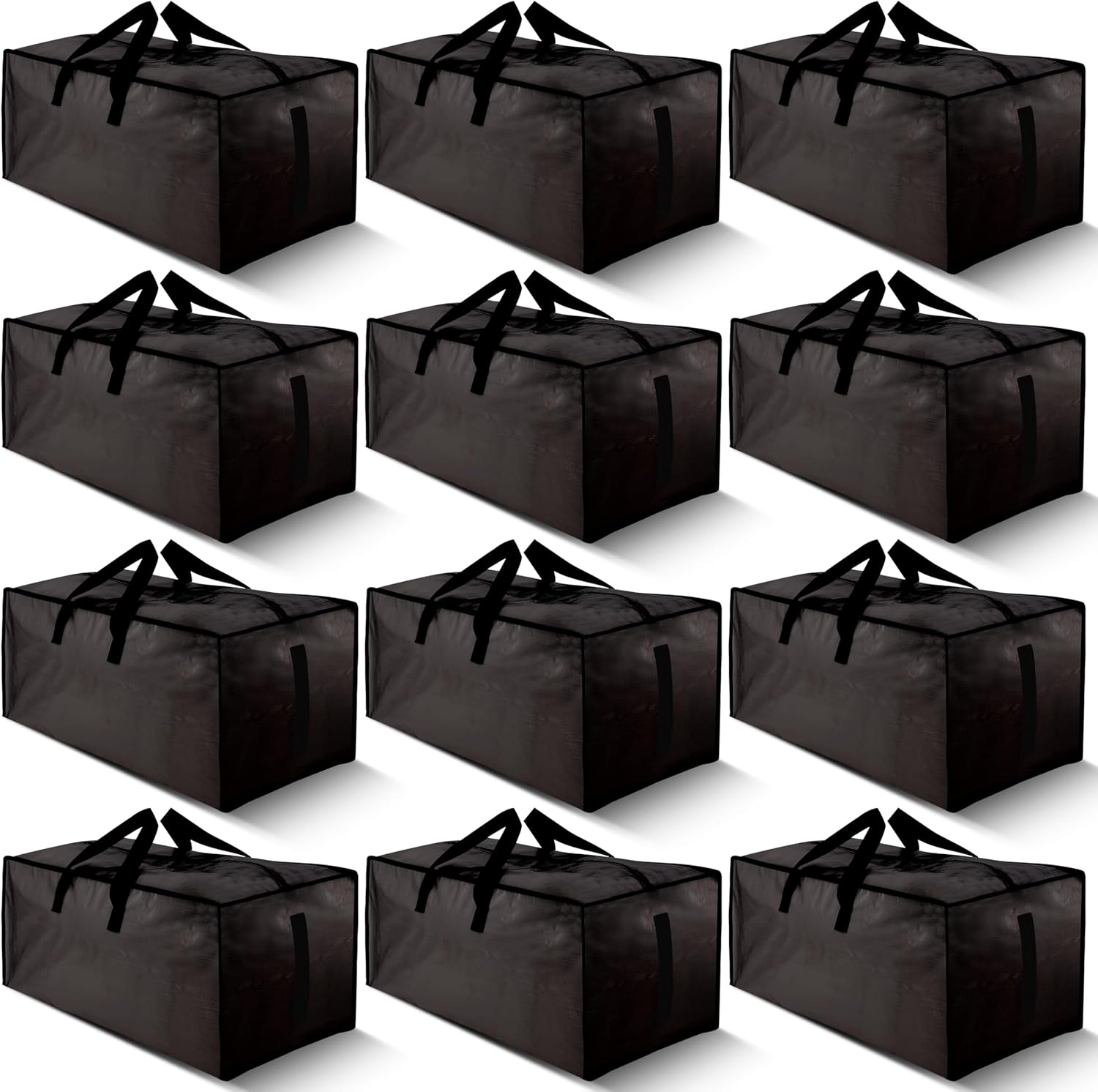 12 Pack Large Strong Moving Bags with Zippers & Carrying Handles - Water-Resistant - Heavy Duty Storage Tote for Space Saving Moving Storage, Fold Flat, Alternative to Moving Box (Black)