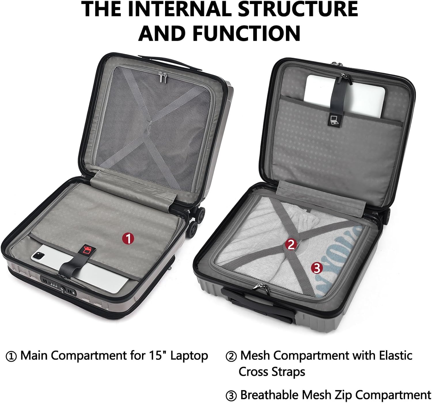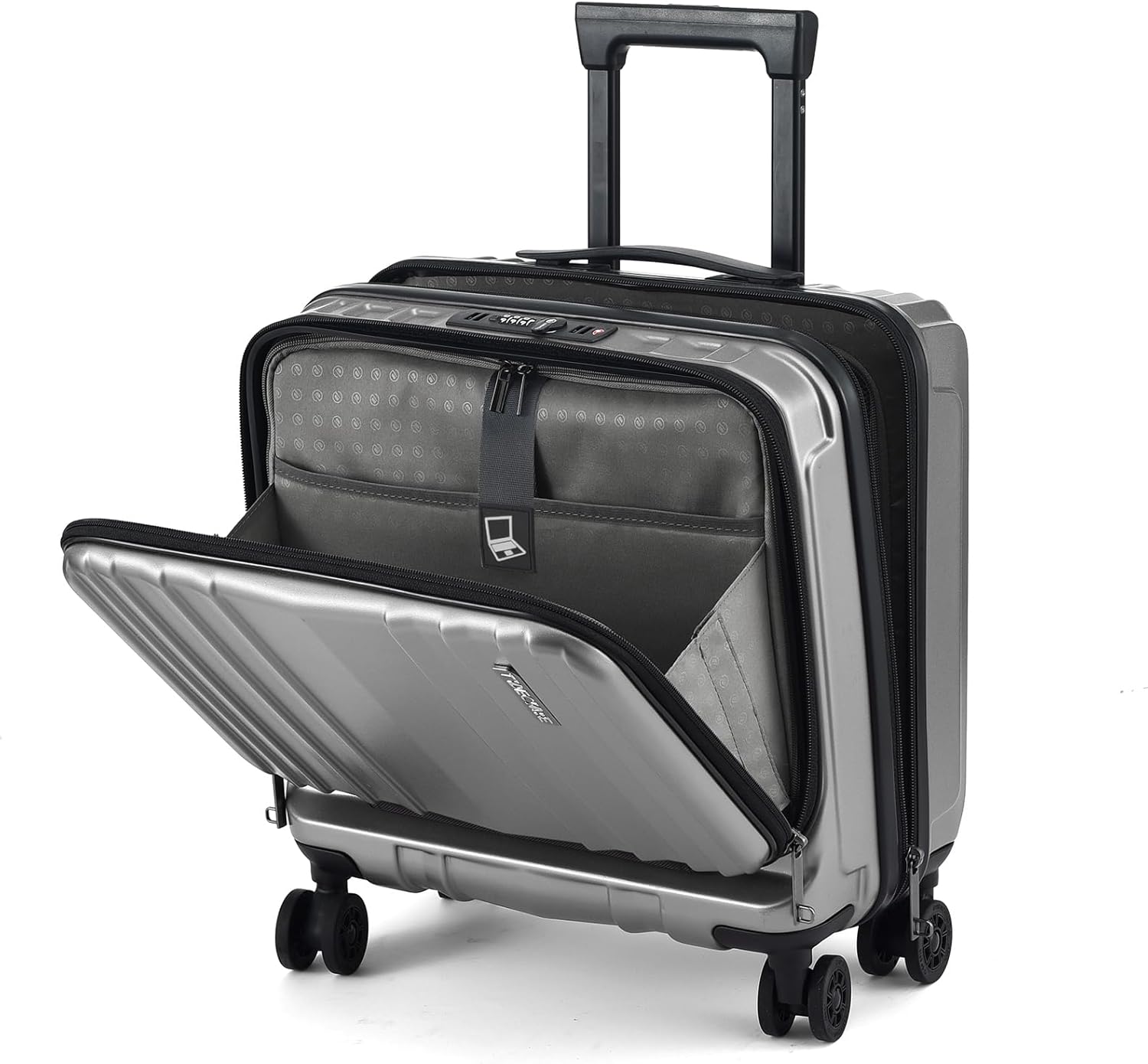 TydeCkare 16" Carry on Luggage with 2 Laptop Compartments, Lightweight Hardshell ABS+PC Suitcase with Dual Control TSA Lock, with YKK Zipper, 4 Spinner Silent Wheels, for Business Travel, Silver Grey