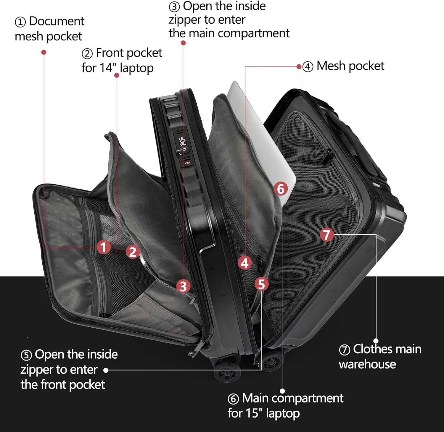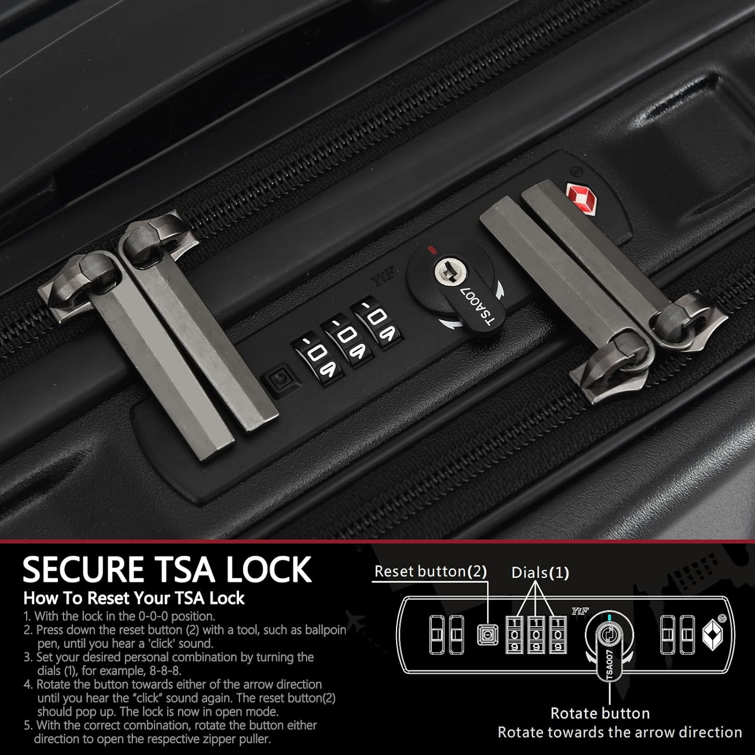 - Dual Control TSA Lock & YKK Zipper: Top mounted double control TSA Lock with one 3 digit combination. One Lock controls the front compartment and the other controls the main compartment. Tips: No keys required, Key is only owned by custom officials.The factory default code for new luggage is 0-0-0, please refer to the manual or details page for the reset password steps. Smooth and sturdy YKK zipper reverse coil prevents burst zipper, zippers are not easy to be pierced by sharp tools.