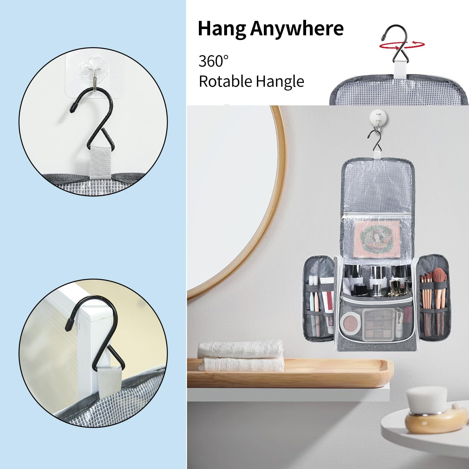 - Sturdy Metal Hooks: The sturdy hooks allow you to hang your toiletry bag on any hook, door, rod, etc. and can be rotated 360° for easy access