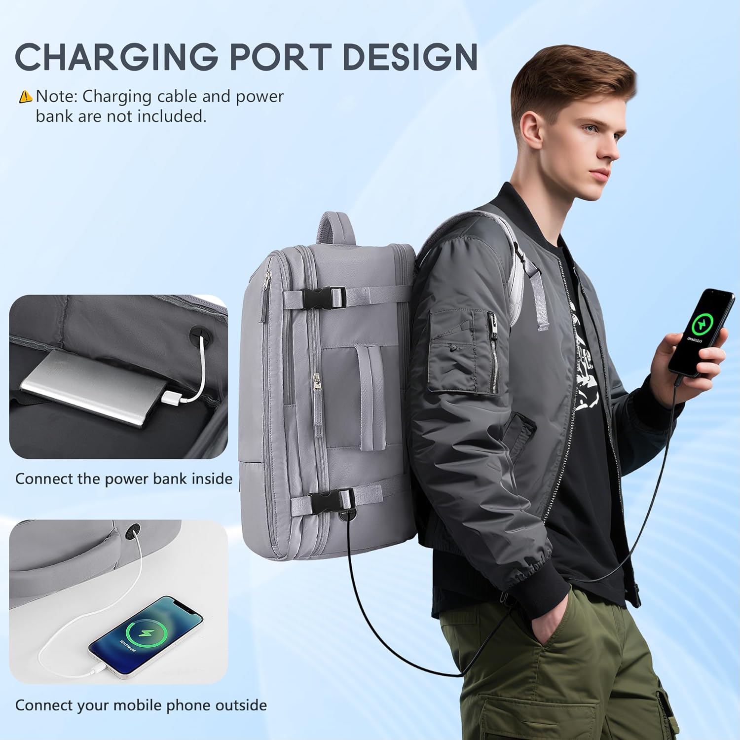 - 【USB Charging & Headphone Port Design】This USB backpack adds a unique charging port design, uses a data cable to connect the power bank inside the backpack and the mobile phone outside, offers you a more convenient way to charge your phone while walking. (Note: The power bank and cable are not included). There are also two extra storage bags that can be used to store toiletries or cosmetics
