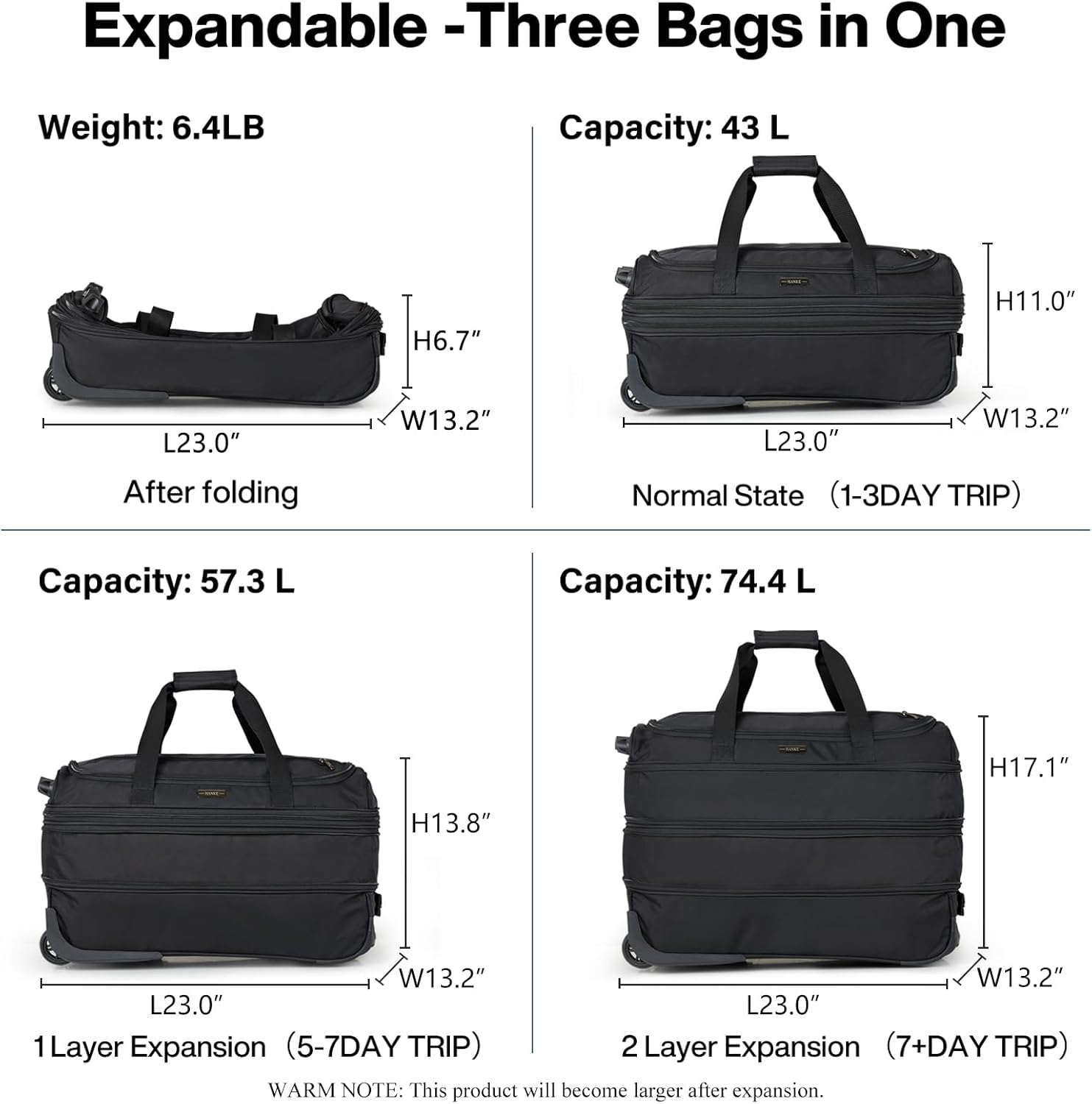 - 【Expandable and Foldable】Three Bags in One: After folding is L23.0" * W13.2" *H6.7", weight 6.4LB, Normal state is L23.0" * W13.2" * H11.0", 43L; 1 layer expansion is L23.0" * W13.2" * H13.8", 57.3L; 2 layer expansion is L23.0" * W13.2" *H17.1",74.4L; It's a carry on Suitcase flight approved and lightweight weekender travel bag. Warm tip: It's best to double-check with the airline.