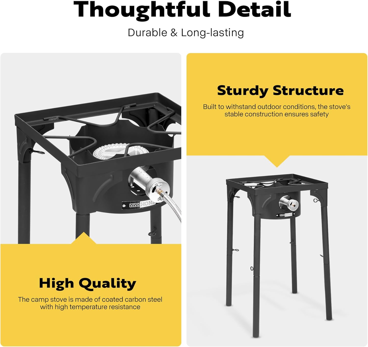 - ROBUST HEAT OUTPUT - This powerful VIVOHOME propane burner can provide high heat output, ensuring efficient and rapid cooking; The regulator's heat dial allows you to control its power to meet your needs; From boiling water to simmering a savory stew, this stove offers the versatility needed