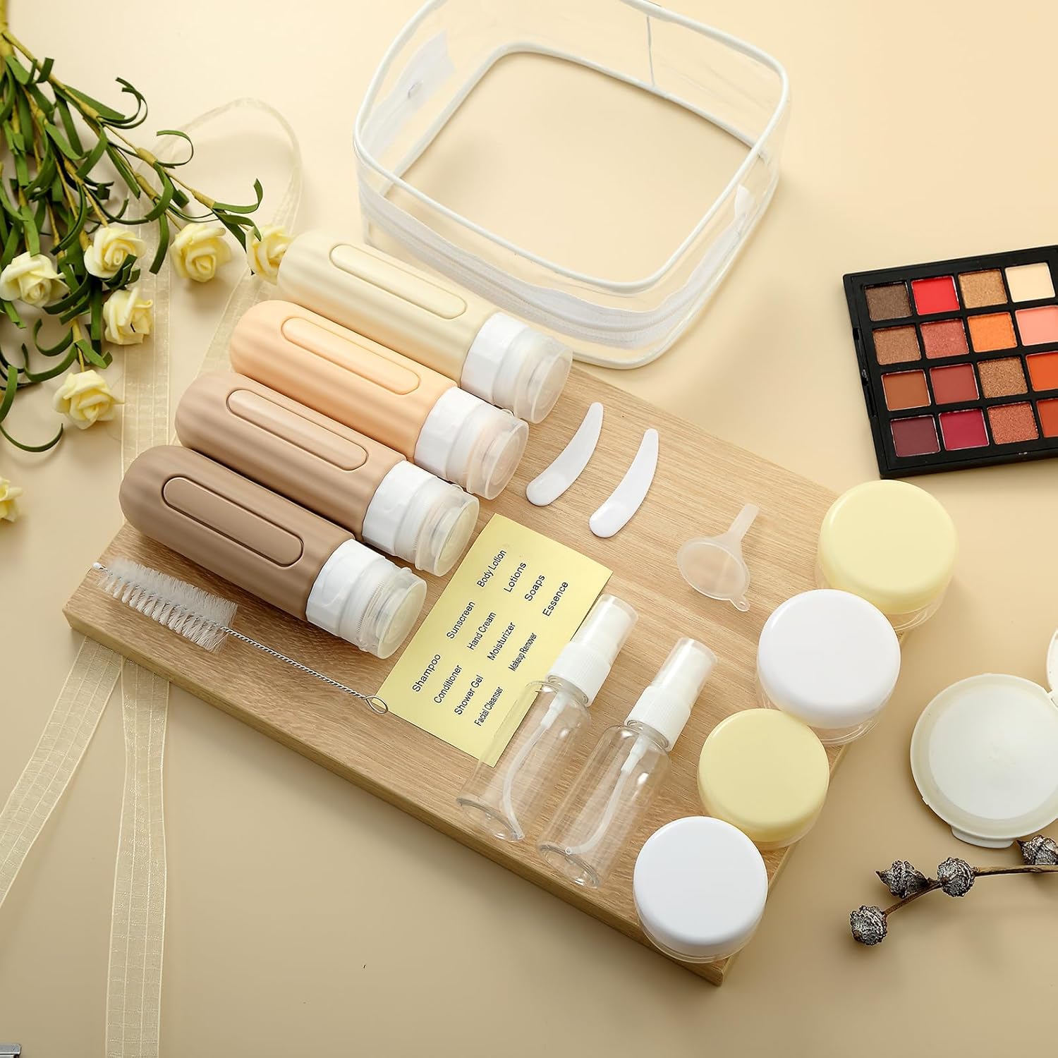 - Useful Travel Accessories: This is a nice assortment of travel containers in a useful zip case. ( Come in 4 Travel Bottles+4 Travel Jars+2 Spray Bottles+2 Scoopers+1 Funnel+1 Clean Brush + 1 Page Label + 1 Clear Toiletry Bag ) Multiple ones allow you take along different beauty products and toiletries according to your requirement
