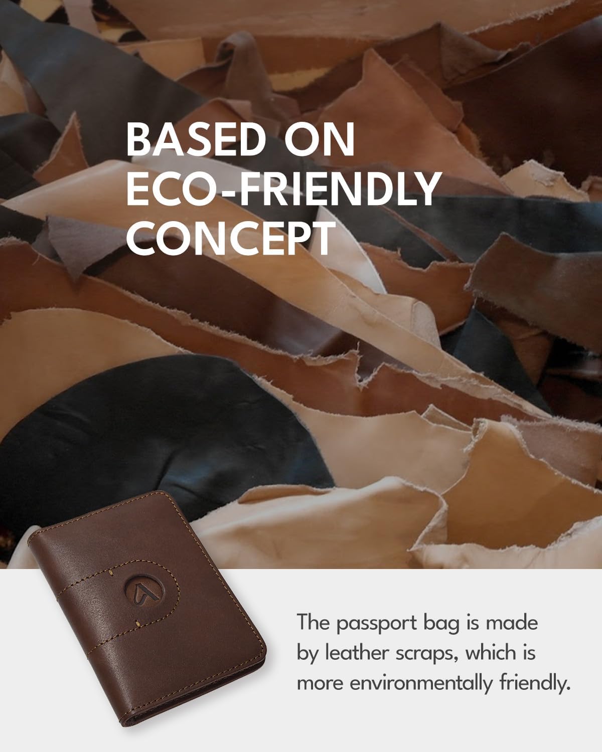 - Genuine leather passport holder:It is made from leather scraps.Making it an eco-friendlier choice. The high-quality full grain cattle leather material gives the wallet a sophisticated and luxurious feel, with durability, fine texture, soft and touch