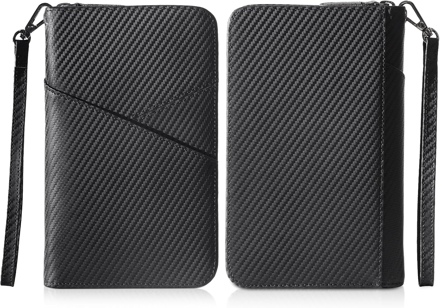 - Large Capacity: 2 passport pockets, 4 credit card pockets, 1 ID card window, 2 large internal pockets for cash on the left and right sides, 1 surface pocket, 1 pen holder and 1 removable wristlet strap. Dimensions: 5” L x 8” H. Item weight: ~0.44lbs. Spacious enough to keep your travel necessities close at hand.