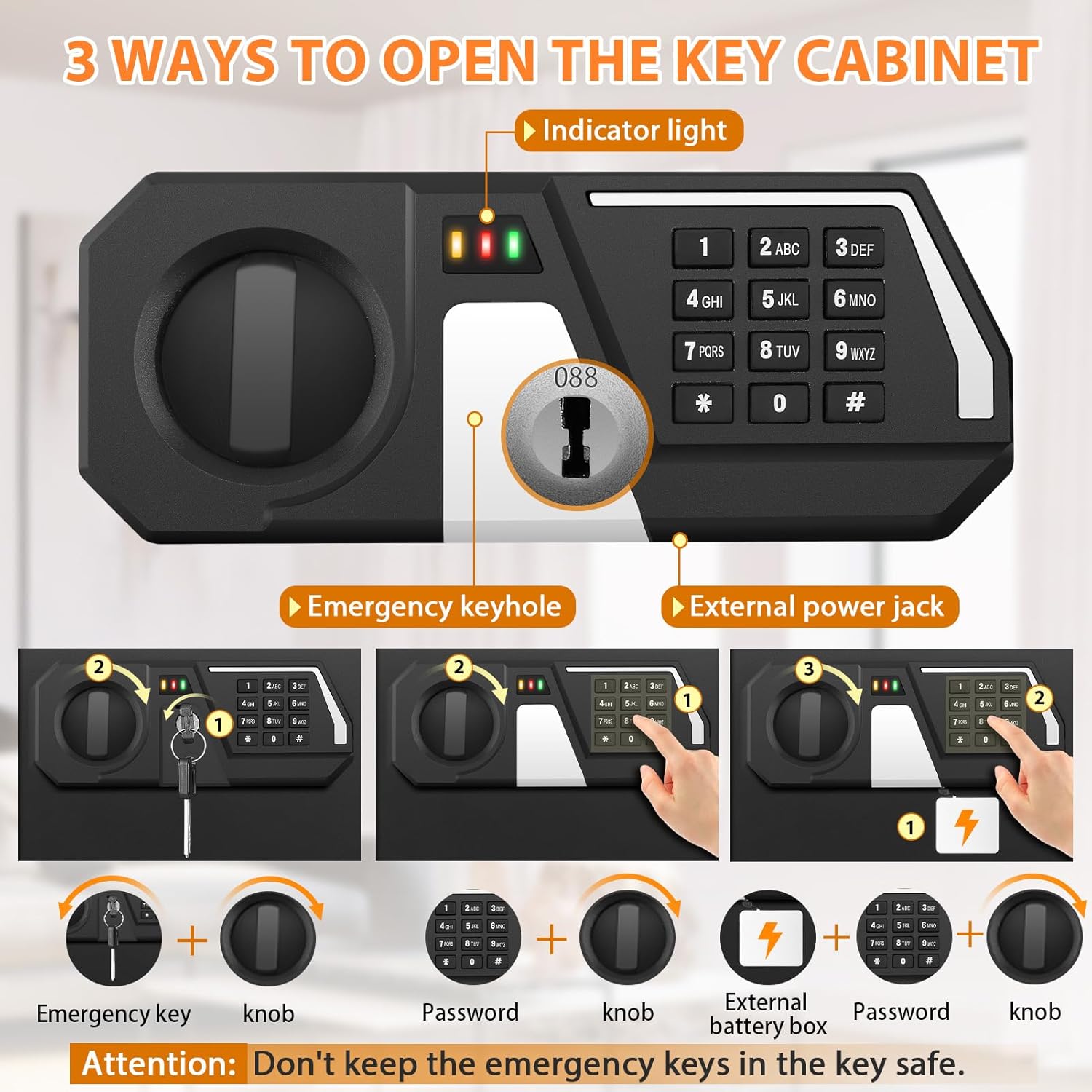 - 3 Ways To Open The Key Box: 1. Emergency key+knob. 2. User/master code(3-8 digits)+knob. There are more than 100 million combinations of 3-8 digit codes for the key box. No need to worry about curious children or others making random access by guessing. 3. Replace the batteries from the externally hidden battery compartment in case the key is lost and the battery dies. The key storage lock box equipped with internal LED light, you can quickly access your keys in the dark