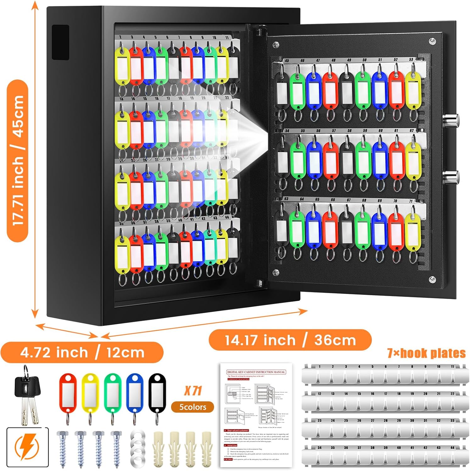 - What You Will Get: A key lock box for 71 keys, two emergency keys, a set of key hooks and key tags, a set of mounting bolts, an external box and a user manual. If you have any questions, you can contact us and our professional customer service team will solve your problems within 24 hours. Your satisfaction is very important to us