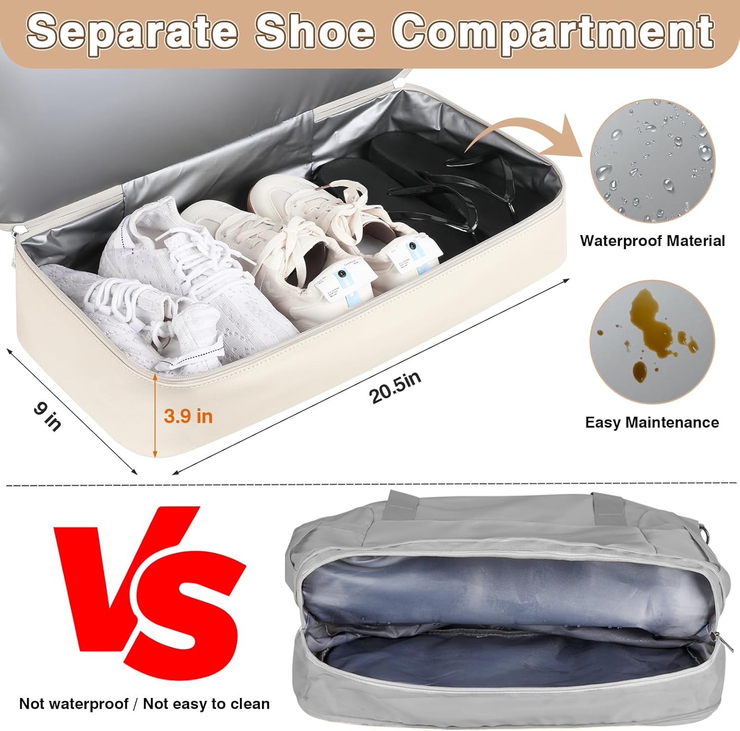 - DRY WET SEPERATED SHOE COMPARTMENT - The dry and wet separation compartment of this weekender bag is fmade of high density water resistant material to facilitate carrying your shoes during travel. This compartment can also be used to hold dirty clothes or wet towels, separating wet and dry to prevent your clean luggage from getting soiled or wet. Shoes compartment size:20.5 * 9 *3.9inch and can fit up to 3 pairs of shoes. The thicker bottom can better carry weight.