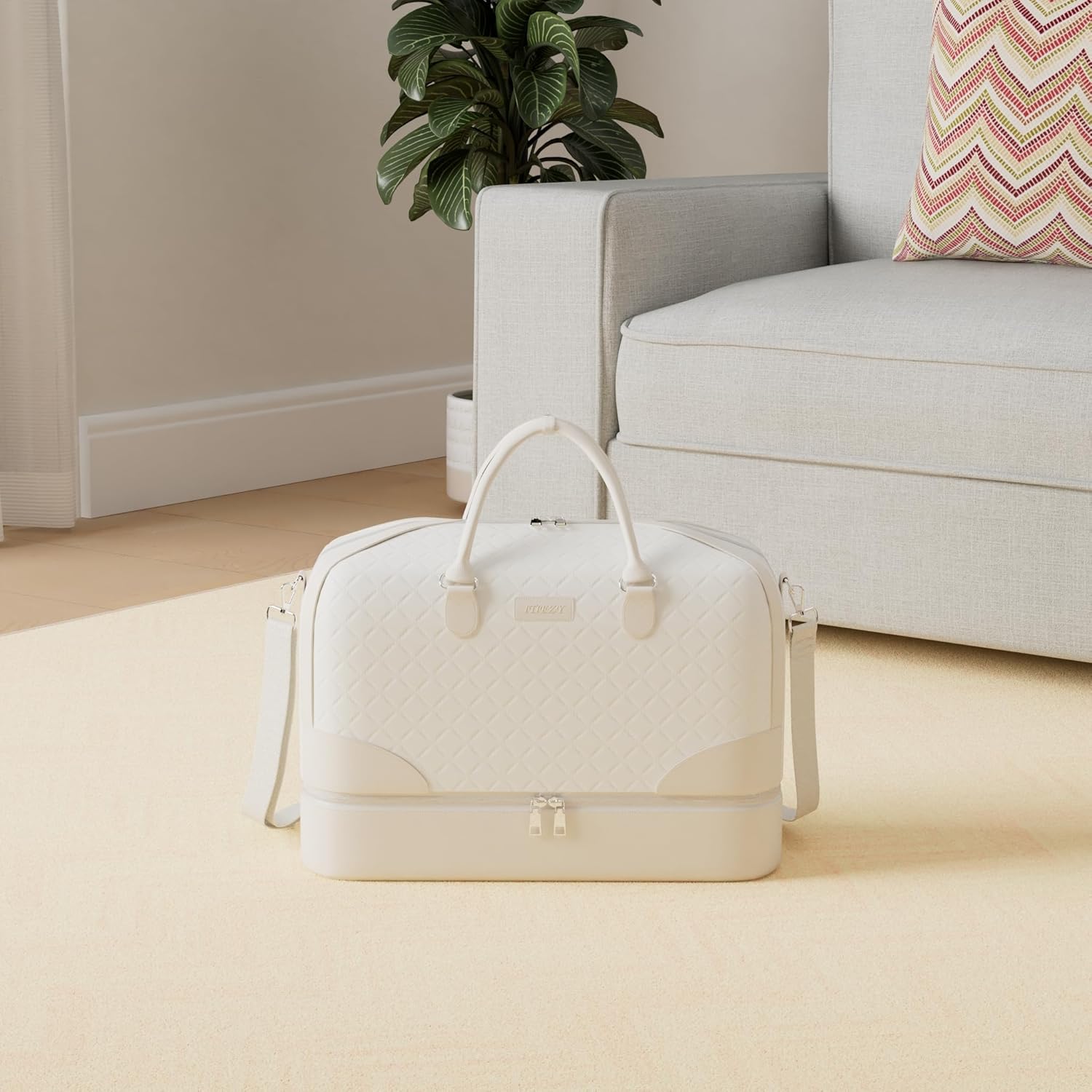 - LARGE WEEKEND BAG FOR WOMEN - The travel bag featuring multiple pockets and compartments for stuff organization, roomy space can fit in 3-5 days of travel essentials, easily fit into your clothes, toiletries, shoes, laptop(up to 17 inch) and other items. In the back of the duffle bag there is a pocket for easy access your smart phone, IDs or passport. Featuring with classy and gorgeous appearance, Our travel duffel bags reach morden urban ladies greatest demand and fantasy on travel bag.