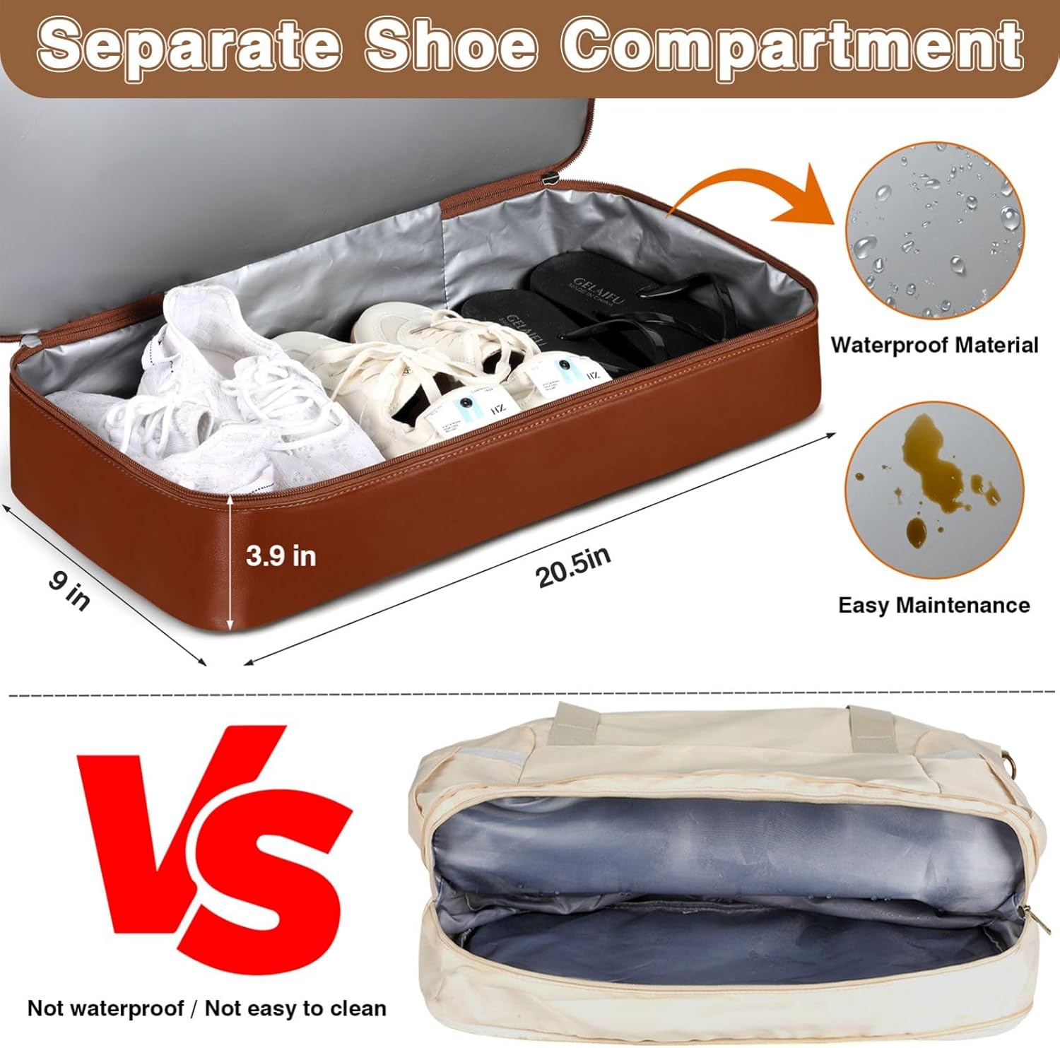 - DRY WET SEPERATED SHOE COMPARTMENT - The dry and wet separation compartment of this weekender bag is fmade of high density water resistant material to facilitate carrying your shoes during travel. This compartment can also be used to hold dirty clothes or wet towels, separating wet and dry to prevent your clean luggage from getting soiled or wet. Shoes compartment size:20.5 * 9 *3.9inch and can fit up to 3 pairs of shoes. The thicker bottom can better carry weight.
