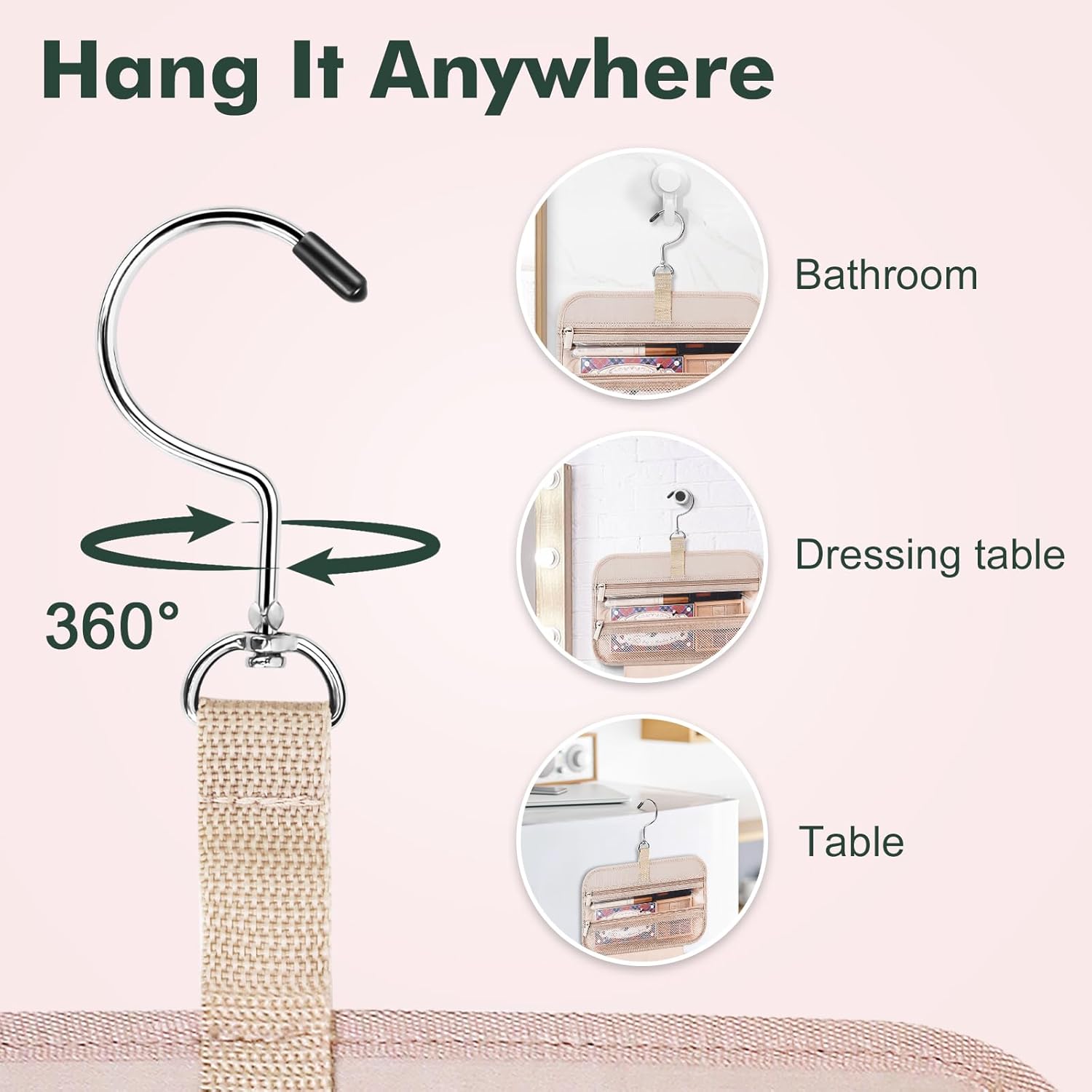 - Humanized Design: This cosmetic bag hook is made of 304 stainless steel metal material, which is sturdy and functional, you can hang the cosmetic bag on the towel rack, cloakroom, or any place where you need to display your toiletries and cosmetics. Travel toiletry bag with a U-shaped opening design is more convenient for you to pick up items.