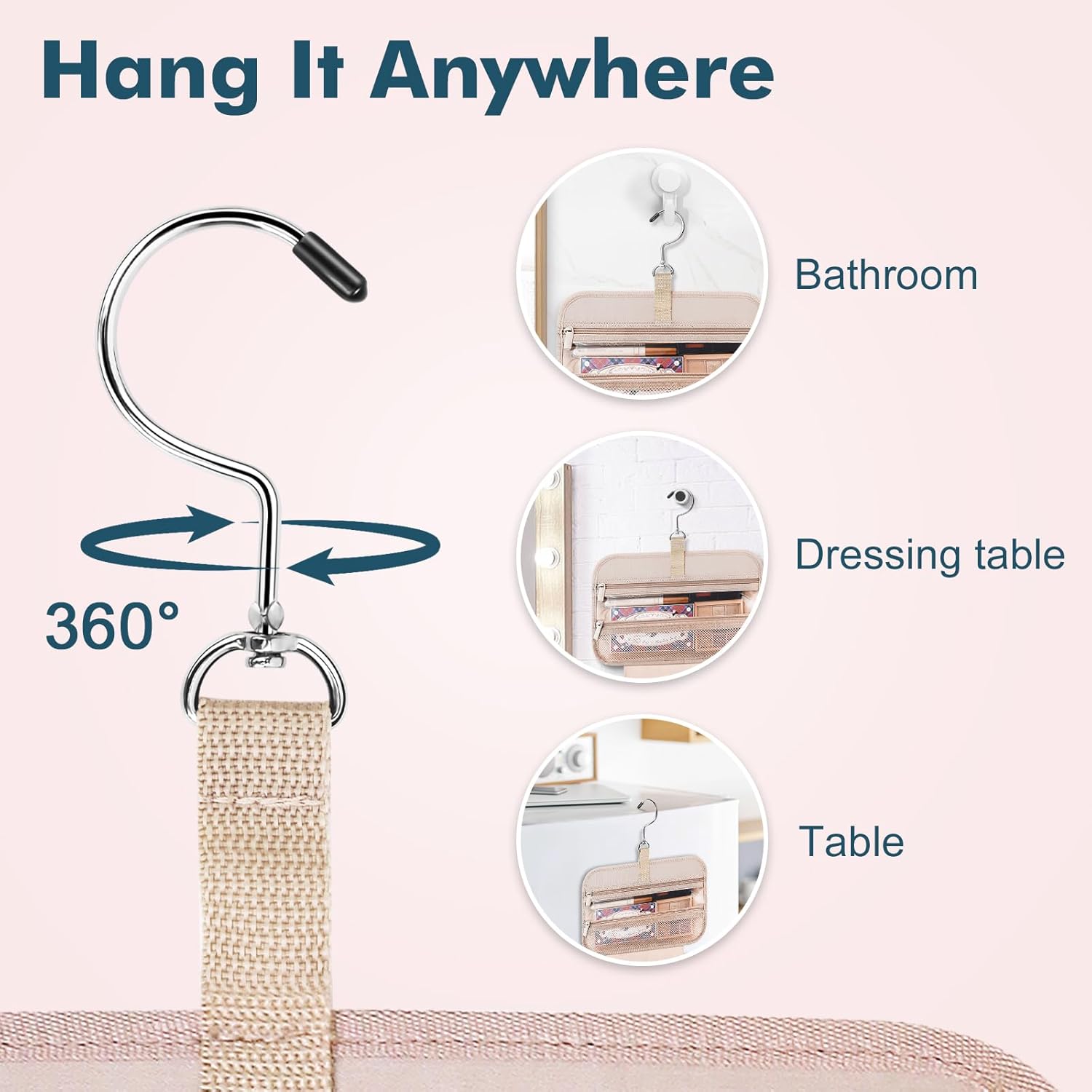 - Humanized Design: This cosmetic bag hook is made of 304 stainless steel metal material, which is sturdy and functional, you can hang the cosmetic bag on the towel rack, cloakroom, or any place where you need to display your toiletries and cosmetics. Travel toiletry bag with a U-shaped opening design is more convenient for you to pick up items.