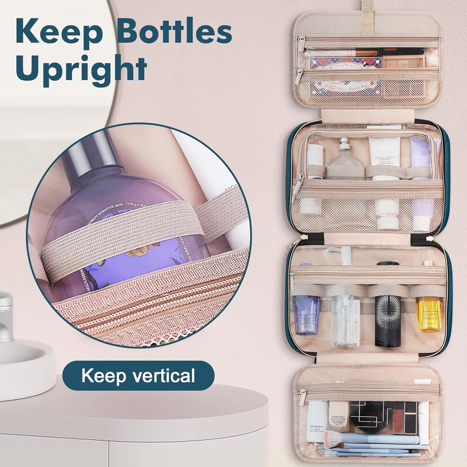 - Neat and Organized: There are 4 separate compartments inside the travel makeup bag to keep all your items organized, 2 large main rooms with elastic straps of various sizes, that can accommodate bottles of various shapes and keep the items standing upright. 1 transparent PVC large bag is convenient for storing your mask and cosmetics, plus 1 PVC transparent bag and a mesh bag compartment for conveniently storing your makeup tools, and realize the separation of dry and wet, neat and orderly.