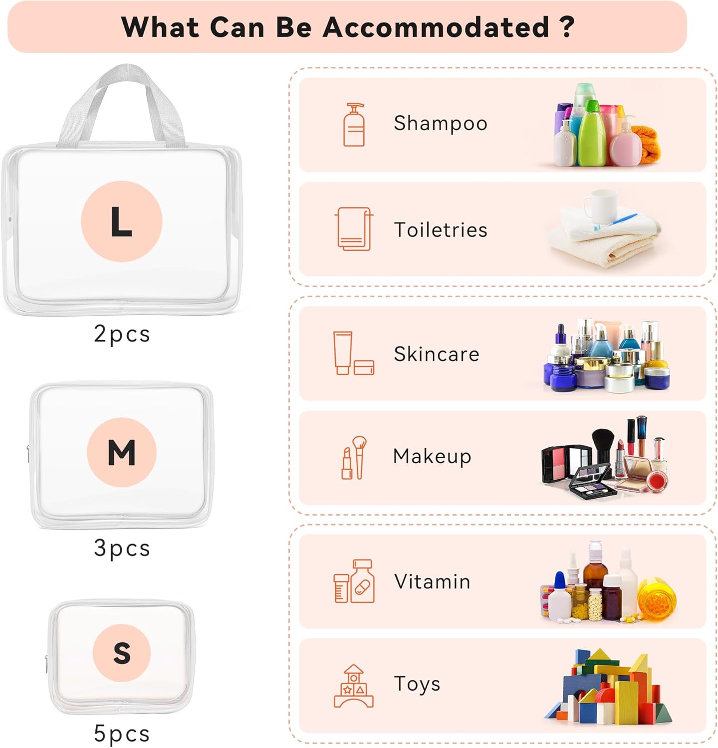 - 【10 Pieces 3 Diffrent Sizes】2 x Large clear handbag,11.8" x 3.9" x 8.6";3 x Medium clear toiletry bag,9.4" x 1.9" x 7.8";5 x Small clear cosmetic bag,7" x 1.5" x 5.5". The clear travel bags perfect for cosmetics, toiletries, baby items, shaving kit, electronic devices, perfume, sunglasses, lipstick, facial cleanser, passport and so on.